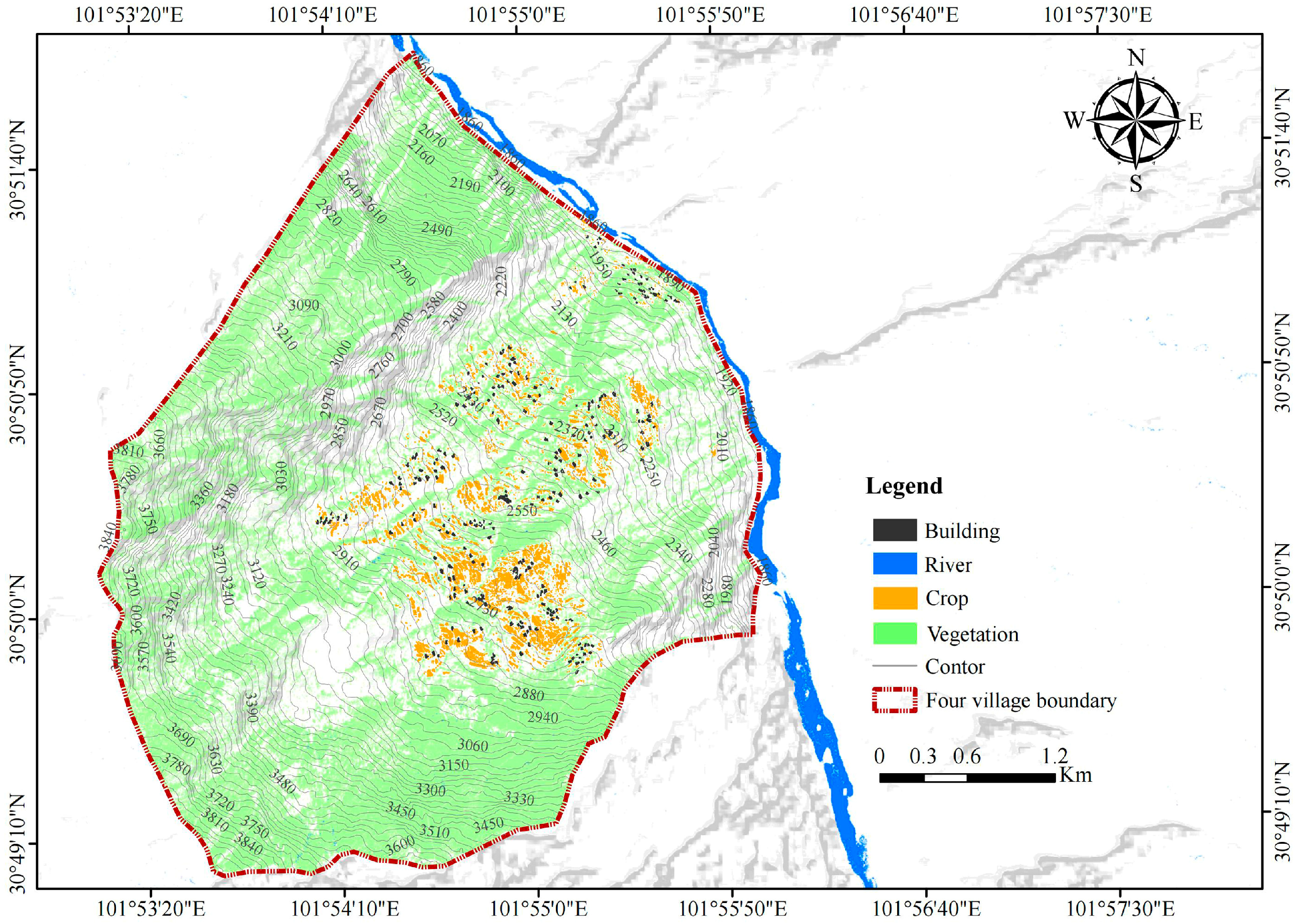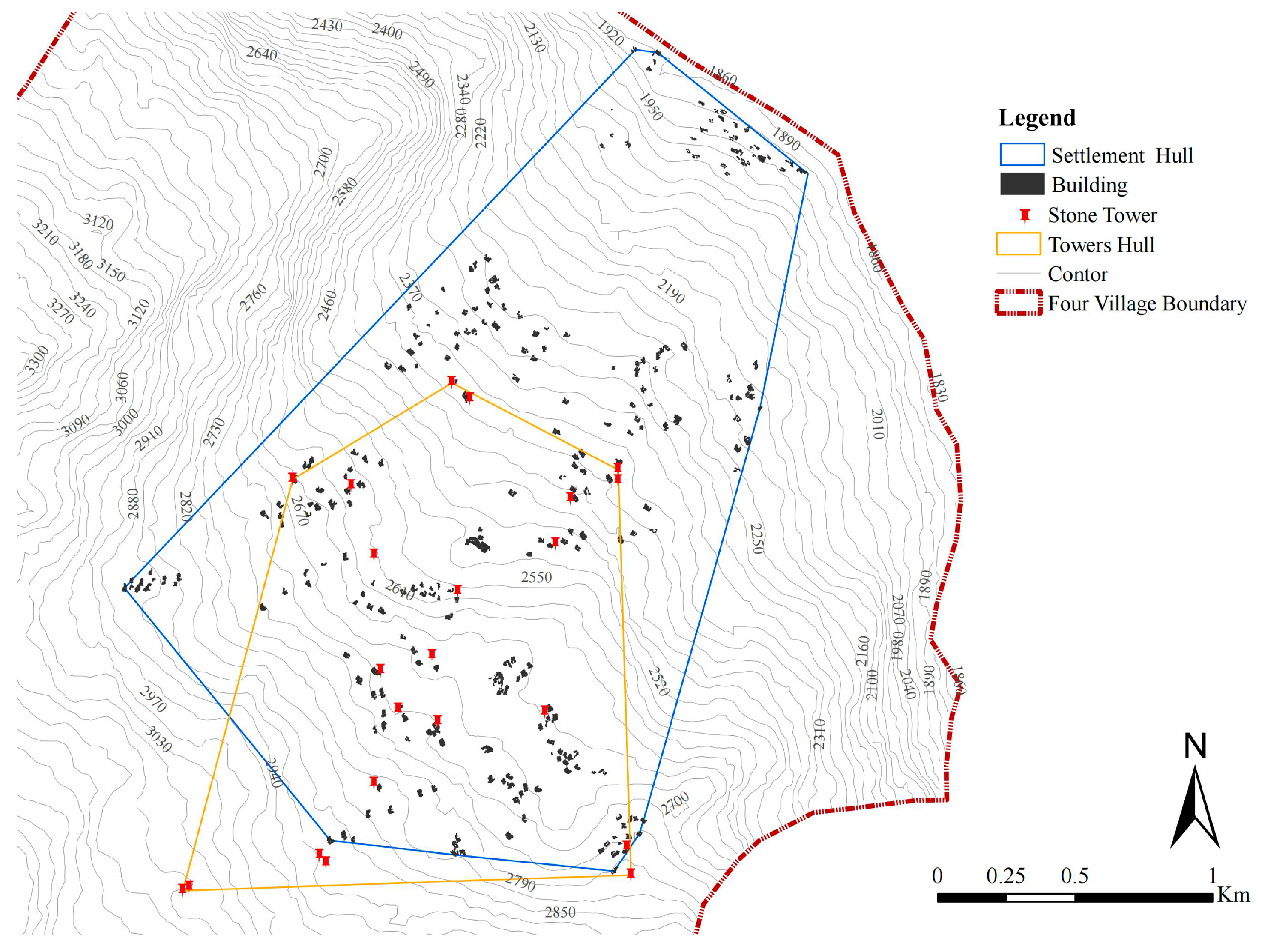 Villages in Suopo cling to the Dadu Valley’s steep slopes, backed by mountains and fronting the river—terrain that is both arable and defensible. Winding roads follow natural contours, while houses and watchtowers interlock in staggered patterns, giving the settlement an organic growth form. Traditional dwellings are three- to four-story stone-and--wood structures, with livestock pens and storage on the ground floor and living and drying spaces above, reflecting a mixed farming and pastoral lifestyle. This study focuses on four contiguous villages—Xiala, Zegong, Zezhou, and Songda—on the west bank of the Dadu River within Suopo Township. Their settlement patterns closely mirror those of other high-altitude canyon villages in Danba County, making them exemplary case studies. Although they are officially four separate villages, these settlements have merged organically and now form a contiguous unit. Accordingly, this study treats them as a single entity, using their combined administrative boundaries as the analysis area. We perform a micro-level spatial–environmental coupling analysis—examining slope gradients, slope aspects, water systems, roads, and farmland—to uncover how these factors shape settlement siting and layout. This approach yields precise spatial controls and indicators to guide sustainable development planning.