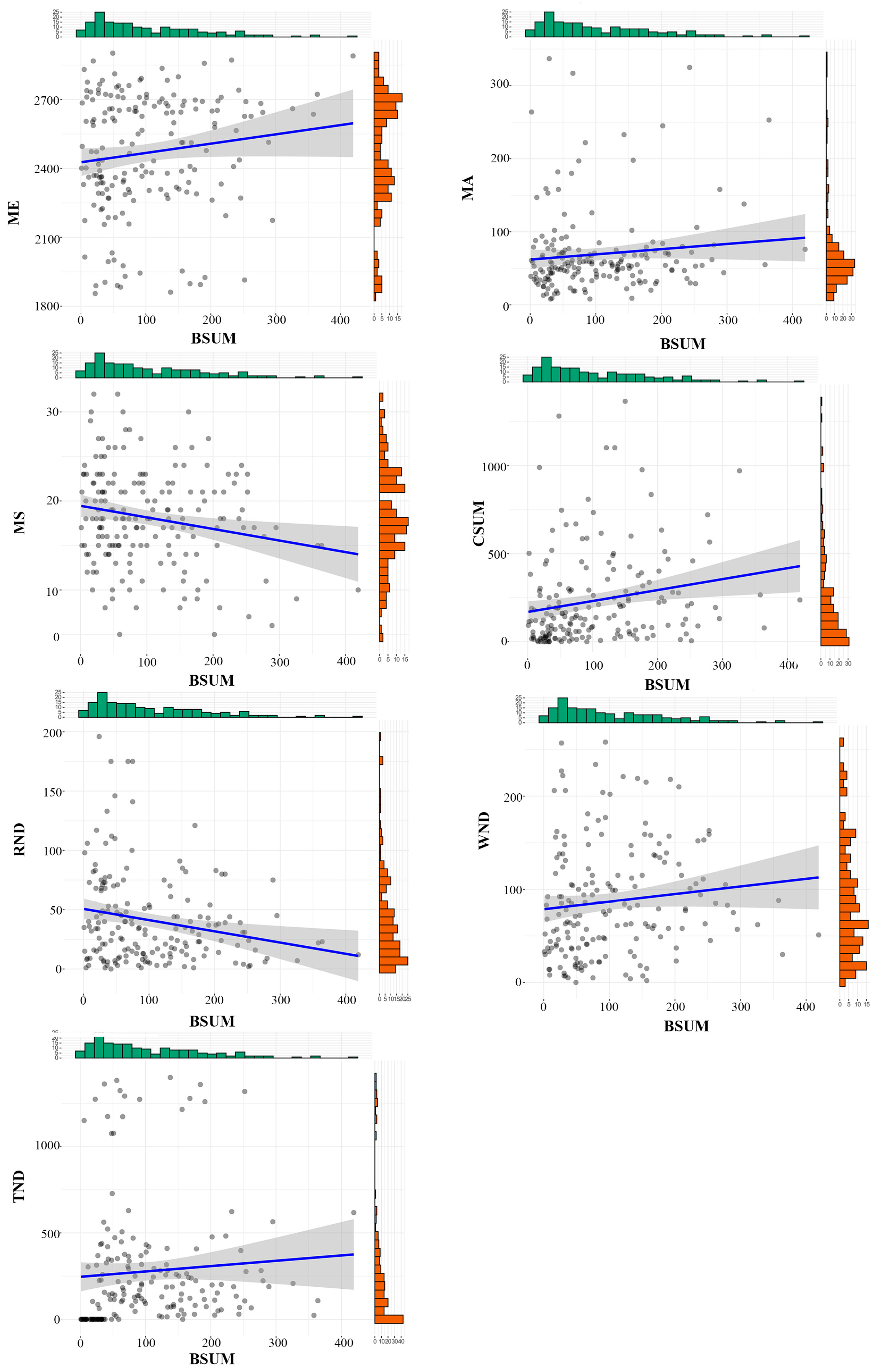 Figure 5. Scatterplots show that the relationship between built-up area (BSUM) and multiple influencing factors, including topographic features (mean elevation, ME; mean aspect, MA; mean slope, MS), cropland area (CSUM), and accessibility variables (distance to nearest road, RND; distance to nearest water body, WND; and distance to nearest historic tower, TND). Each panel displays the distribution of BSUM against one variable, with a fitted regression line (blue) and 95% confidence interval (shaded area).