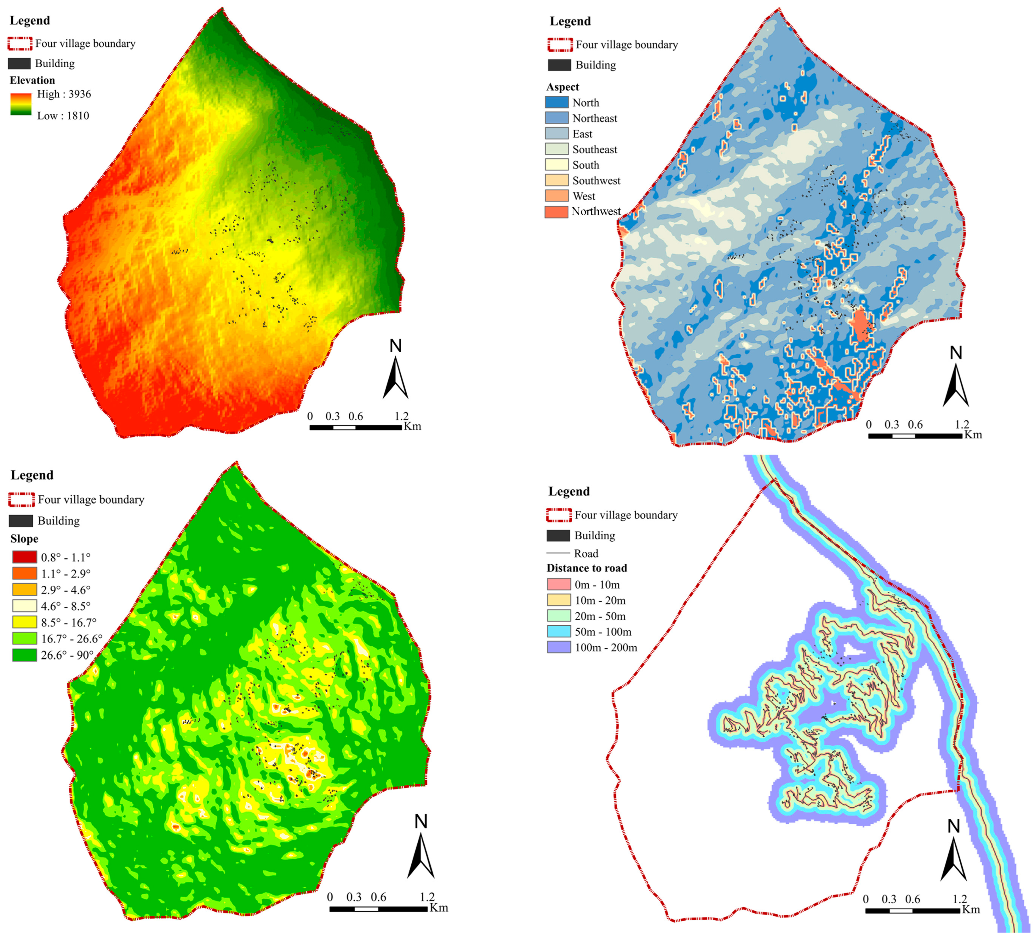 Figure 6. Spatial distribution of topographic (elevation/aspect/slope) and road accessibility for buildings in the study area.