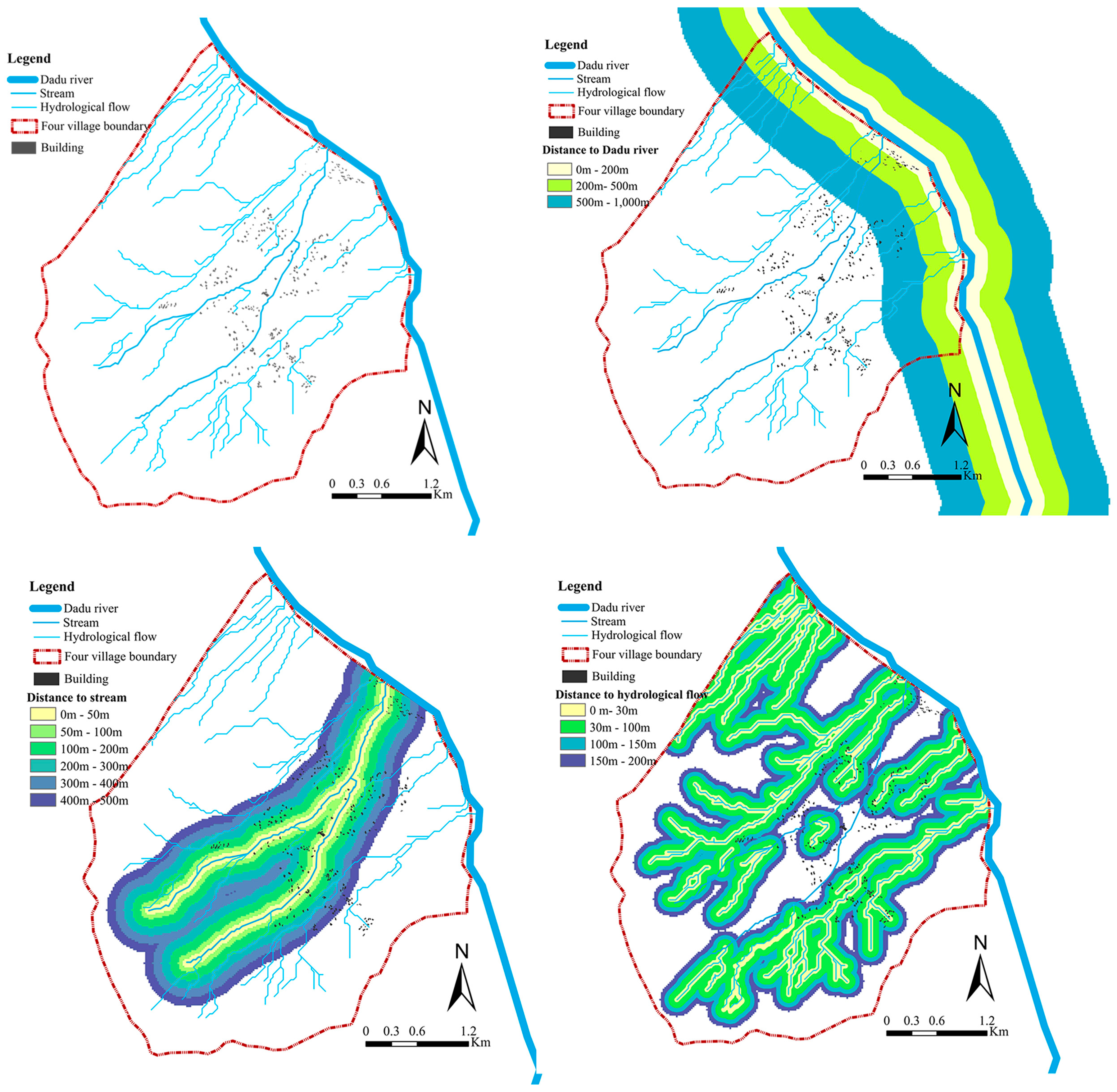 Figure 7. Proximity to the three-tier water network: Dadu river, streams, and runoff channels.