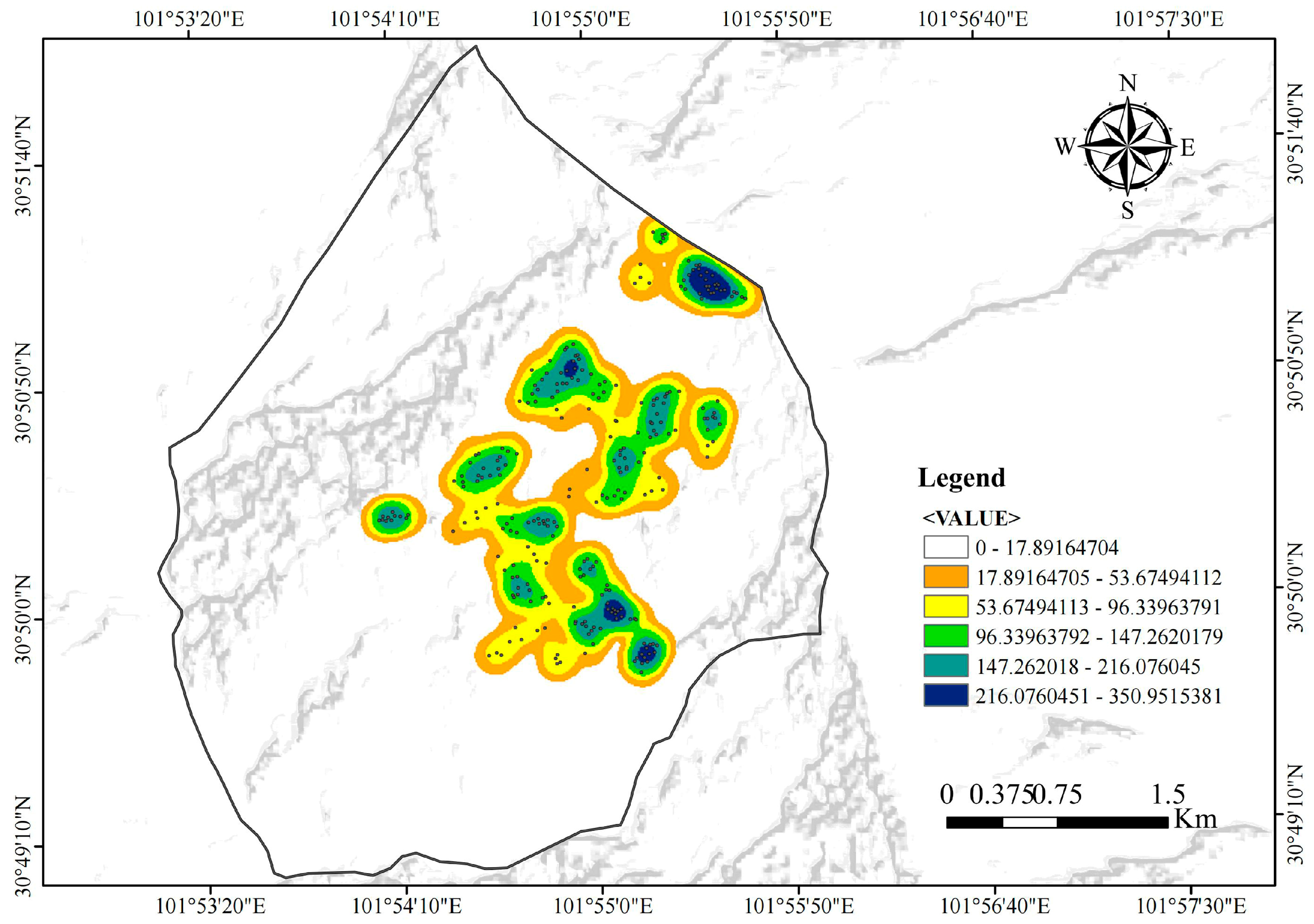 The kernel density map highlights four main high-density cores (dark blue). The first is 100–300 m east of the main road on the Dadu River’s right bank at about 1900–2100 m of elevation; here, tightly packed, newer buildings suggest growth along the thoroughfare. In the southeast, two adjacent cores at 2600–2800 m sit on gentle slopes with broad farmland and older buildings—including historic towers—likely marking the original settlement. The fourth core in the northwest, around 2350 m, also lies on mild terrain but consists of more recent structures. Between these cores, secondary belts (light blue to yellow) about 200–300 m wide show density fading outward. In contrast, ridges above 2900 m and steep cliffs have almost no buildings, creating clear blank zones (Figure 8).