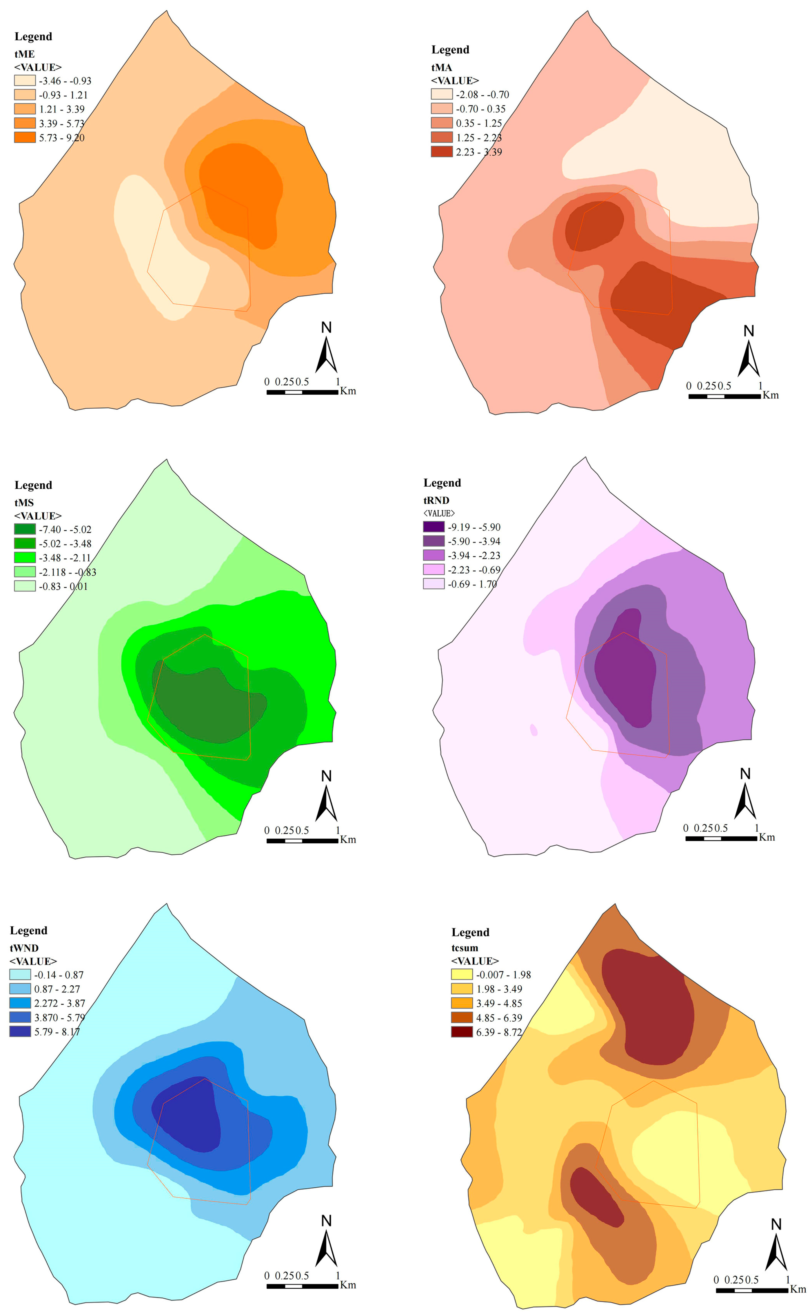 Figure 10. Spatial Distribution of Local t-Values from GWR Analysis for Six Explanatory Variables.