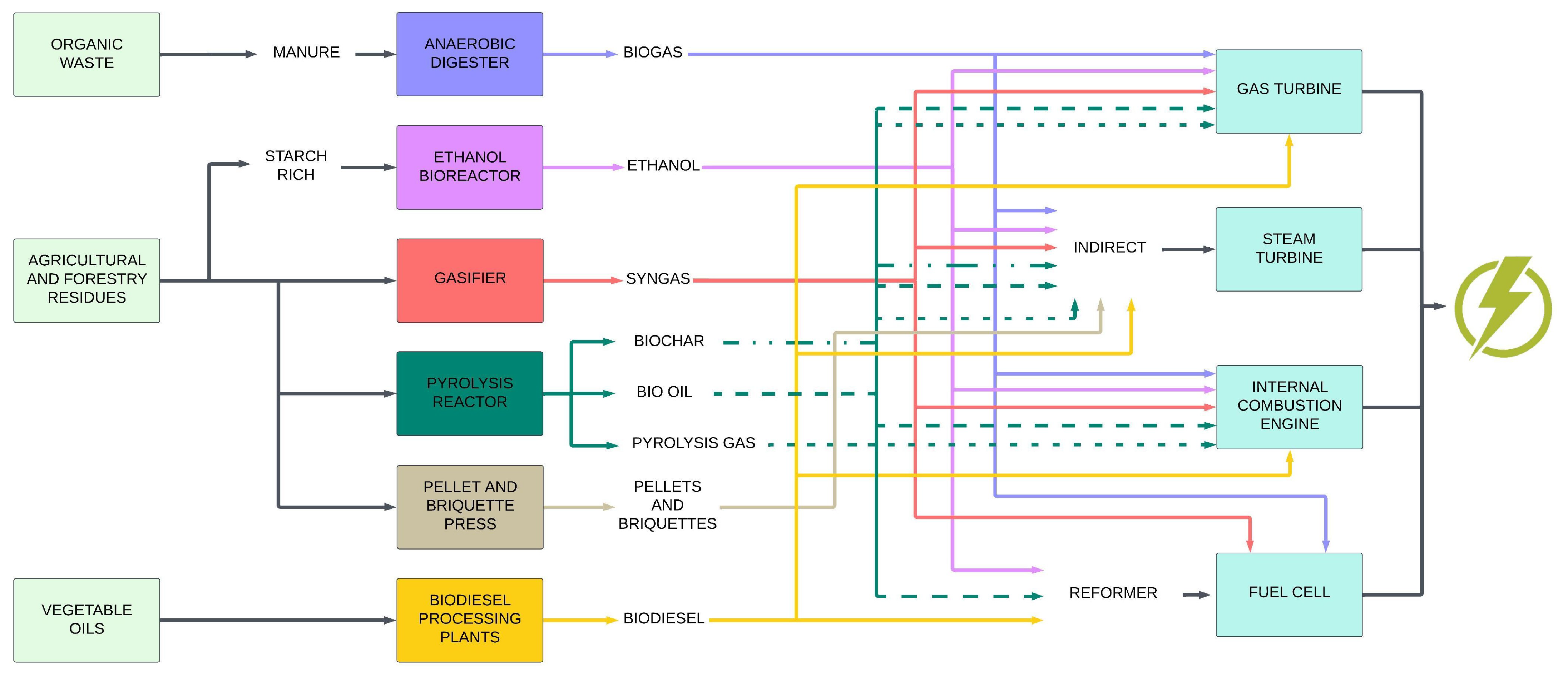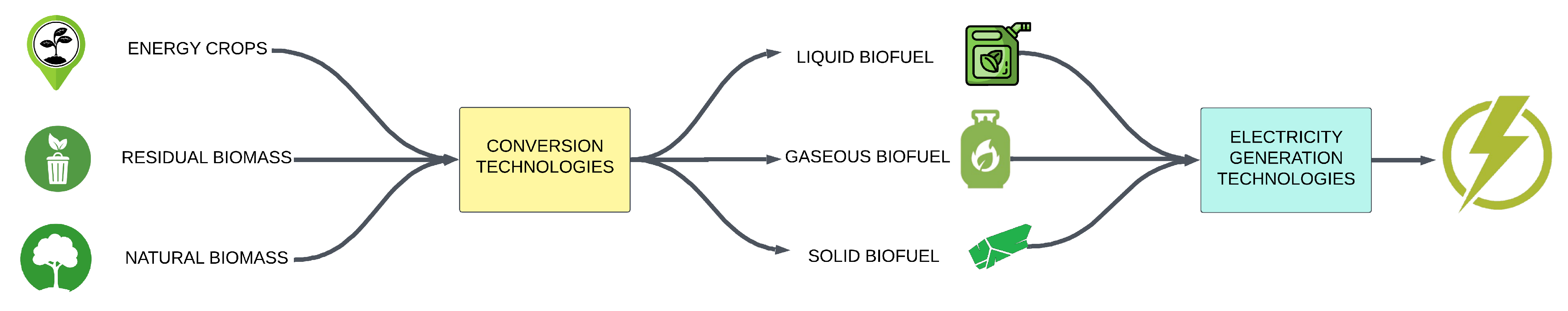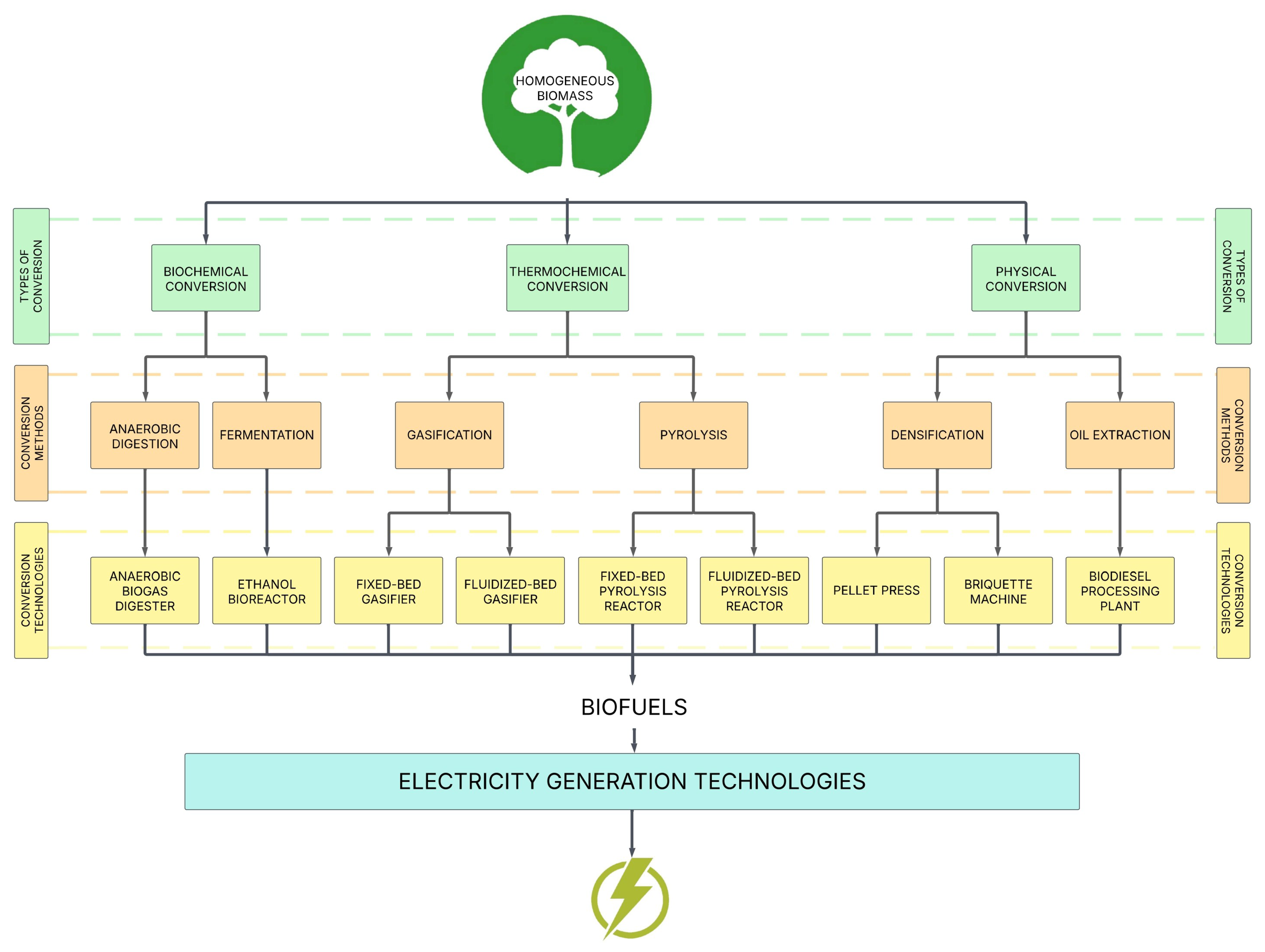 - A structured overview of biomass to electricity pathways, covering residue identification, biofuel conversion, and power generation.