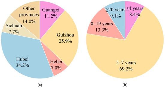 Figure 1 presents the geographic distribution of 143 CCER projects in agriculture and forestry, overlaid on a map of greenhouse gas emissions in 2022. CCER projects were predominantly concentrated in southern and eastern China with relatively high emission levels. This pattern suggests that regions with greater emissions are more likely to adopt voluntary carbon markets as mitigation policies [29]. Among all provinces, Hubei, Guangxi, and Guizhou stood out as the most active regions in the implementation of the CCER policy, registering 49, 37, and 16 projects, respectively (Figure 2a). The majority of projects (69.2%) had crediting periods of 5 to 7 years, followed by those with a duration of 8 to 19 years (13.3%) (Figure 2b). Projects with a 4-year crediting period accounted for 8.4% and were primarily household biogas projects initiated in 2009 as part of early pilot efforts. A small share of projects (9.1%) had crediting periods exceeding 20 years, most of which are afforestation projects that continuously produce carbon credits after forest planting.