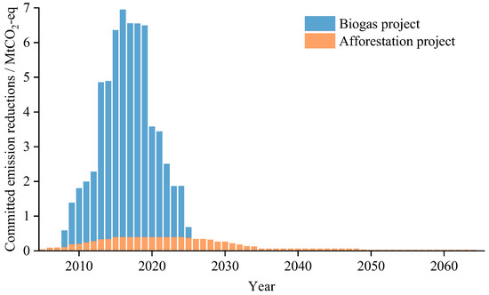 In total, all CCER projects in agriculture and forestry collectively committed to reducing 68.34 MtCO2-eq, which fell into two main categories: biogas and afforestation projects. Although biogas projects were assigned relatively shorter crediting periods, they achieved six times the emission reductions compared to afforestation projects (Figure 3). However, whether these commitments have been realized in practice remains a topic for further investigation. Therefore, in the following sections, we employed econometric models to examine whether CCER projects have indeed delivered measurable emission reductions and contrasted these outcomes with the commitments self-declared by project developers.