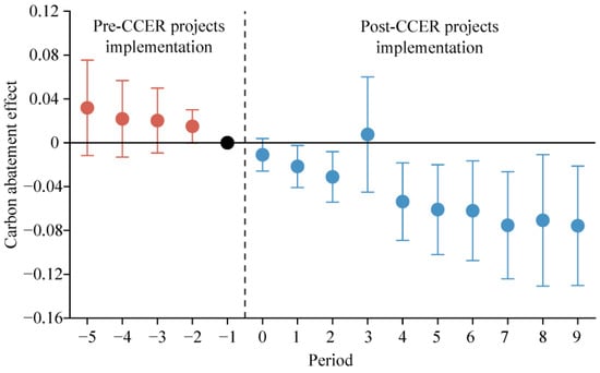 Moreover, project quality is closely linked to the verification agency. Under the CCER framework, project developers are required to estimate expected emission reductions and document them in the PDDs. PDDs, along with emission data, must be reviewed and verified by third-party agencies [36]. In our sample, the two primary agencies responsible for verifying agriculture and forestry projects were the China Quality Certification Centre (CQC) and the China Electronic Product Reliability and Environment Testing Institute (CEPREI). We found that projects verified by these leading agencies exhibited significant emission reductions, whereas projects verified by less prominent agencies led to unapparent carbon abatement (Columns (4)–(6) of Table 3). This suggests that the specialized knowledge of verification agencies plays an important role in ensuring the effective implementation of environmental policies, as emphasized by Yu et al. [37].