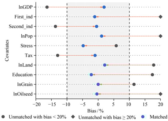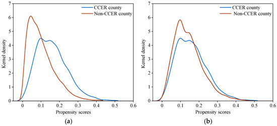 In order to ensure the validity of PSM, it is necessary to conduct pre-matching diagnostics. Two commonly employed diagnostic steps are balance tests of covariates and common support checks. On one hand, we performed covariate balance tests to examine whether the observed characteristics of CCER and non-CCER counties were sufficiently comparable. As shown in Figure 5, before matching, substantial covariate differences existed between the two groups, indicating that simple comparisons would confound the treatment effect. After implementing PSM, the standardized biases of all covariates were reduced to below 10%, suggesting that the matched sample more closely approximates a randomized experiment. On the other hand, we conducted a common support check by comparing the distributions of propensity scores between CCER and non-CCER counties. The distributions of propensity scores became much more similar between the treated and control groups after matching (Figure 6). By removing unmatched observations, we ensured that the matched groups had greater similarity in their covariate profiles, thereby proving the reliability of PSM methods and enhancing the credibility of causal inference [38].