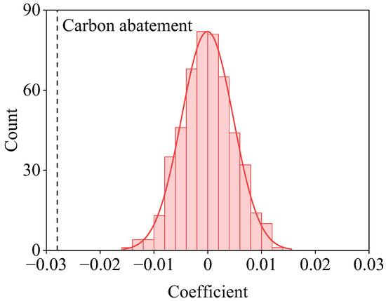 To further validate the reliability of our findings, we conducted a placebo test by randomly assigning CCER treatment status to counties. We randomly selected treated and control counties as pseudo-CCER counties and re-estimated Equation (1) based on this artificial assignment. This procedure was repeated 500 times to generate a distribution of placebo coefficients under the null hypothesis of no policy effect. If the estimated coefficients lie far outside the distribution of these placebo estimates, the observed effects are unlikely to result from random factors. As shown in Figure 7, the estimated CCER coefficient deviates substantially from the distribution of randomly generated coefficients, suggesting that the observed effects are unlikely to be driven by random factors and instead reflect genuine policy intervention.
