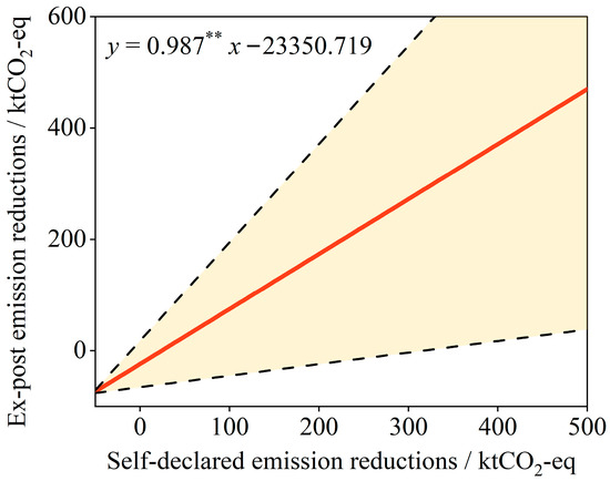 Relationship between project-level self-declared and ex-post emission reductions. Note: The self-declared emission reductions are derived from PDDs, while the ex-post emission reductions are estimated using DID models for each project. The red solid line represents the best-fit curve between these two variables, and the dashed lines denote the 95% confidence intervals. ** p < 0.05.
