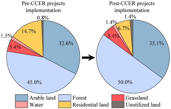 In addition, we examined whether the projects occupied arable land by analyzing land types before and after the implementation of CCER projects. The land use dataset was sourced from a multi-period land use remote sensing monitoring dataset of China [49]. As shown in Figure 9, the share of arable farmland increased from 32.6% before the CCER projects to 35.1% after their implementation. This indicates that CCER projects did not crowd out arable land; on the contrary, many biogas projects even contributed to an increase in the share of farmland, which is consistent with our empirical findings.