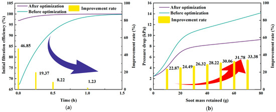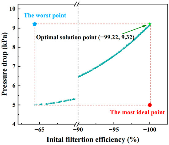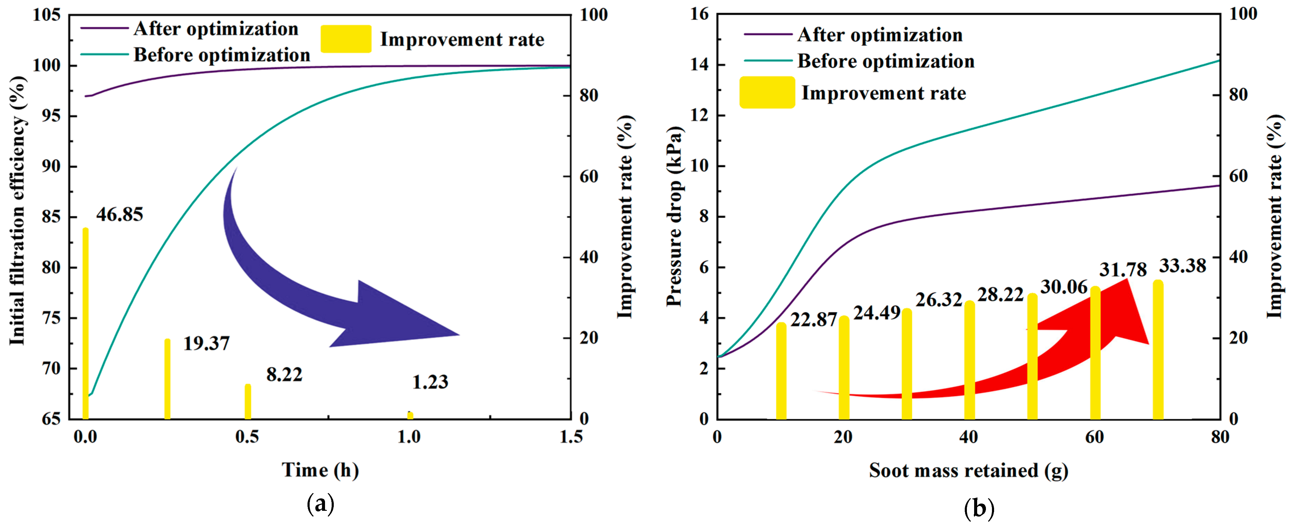 - The ideal solution selected from the Pareto frontier based on the principle of prioritizing emission compliance increases the initial filtration efficiency of the DPF by 46.85% compared with the baseline scheme, while reducing the pressure drop at an 80 g soot load by 34.88%. The deviation between the optimized prediction and simulation results is controlled within 5%, verifying the reliability of the hybrid optimization framework in terms of accuracy and generalization.