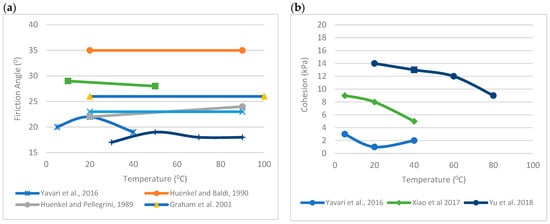 (a) Effect of temperature change on Φ. (b) Effect of temperature change on cohesion (c) (Huenkel and Pellegrini, 1989 [47]; Huenkel and Baldi, 1990 [48]; Graham et al., 2001 [49]; Yavari et al, 2016 [40]; Xiao et al., 2017 [46]; Yu et al., 2018 [45]) Adapted from open access journal ref. [18].