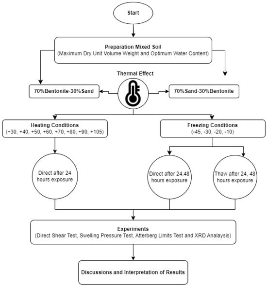 As seen in the studies mentioned in the text, depending upon the thermal condition of the ground, the soil is sensitive to changes in surface temperature [58]. A large number of engineers with geotechnical expertise are concerned with frost heaving and thawing in cold climates. Also, due to the phenomena caused by human activities and global warming, many problems are encountered regarding the stability of embankments. In this context, the aim of this study is to study the mechanical and physical properties of the soil and the changes possible in these properties due to temperature changes. Understanding these changes is vital for comprehending the advantages and limitations associated with different environmental conditions and for ensuring the safety and reliability of structures designed to endure temperature variations. To address these objectives, the study followed the outlined methodology depicted in Figure 2.