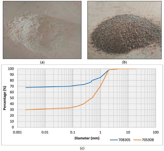 Bentonite (a), sand (b), and sieve analysis of 70B30S and 70S30B (c).