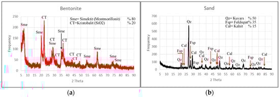 The bentonite employed in this study was obtained from KarBen Inc. (Tokat, Turkey). Prior to use, the raw material was sieved through a 40-mesh screen to remove coarse particles (Figure 3a). The main physical and chemical properties of the bentonite are presented in Table 1. This clay mineral is soft, easily disperses in water, and exhibits a greasy texture when moist. It has a high capacity for water uptake and swelling due to its extremely fine crystal structure and large specific surface area [59]. Bentonite originates from the alteration of volcanic materials such as ash, tuff, and lava, and is typically rich in aluminum and magnesium compounds. In this research, sand was supplied from a local construction company in Safranbolu, Karabük. The material was washed, oven-dried, and passed through a No. 40 sieve prior to testing (Figure 3b). Grain size distributions for the mixtures of 70% clay + 30% sand (70C30S) and 70% sand + 30% clay (70S30C) are presented in Figure 3c. Based on Standard Proctor tests (Figure 4a,b), the maximum dry unit weight and corresponding optimum water content of the 70C30S mixture were determined as 13.8 kN/m3 and 27%, respectively. For the 70S30C mixture, the maximum dry unit weight was 16.9 kN/m3, and the optimum water content was 20%. In addition, the pure sand and pure bentonite used in the experiments were characterized by XRD analyses, while the particle size distributions of the mixtures are illustrated in Figure 5a,b.