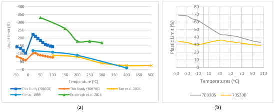 For clays primarily composed of kaolin, the consistency indices are unlikely to change significantly at temperatures up to 400 °C. However, soils containing bentonite as the predominant component tend to experience considerable decreases in the liquid limit (LL) and PI with increasing temperature [55]. The consistency limits for kaolin and bentonite are observed to vary with temperature. Research findings indicate that the impact of temperature is minimal within the range of 100 °C to 200 °C. Kuntiwattanakul et al. [56] also reported similar observations for temperatures ranging from 22 °C to 200 °C. In contrast, Zhang et al. [57] observed that the LL and PL of clay decreased when subjected to heating from 14° Celsius to 35° Celsius.