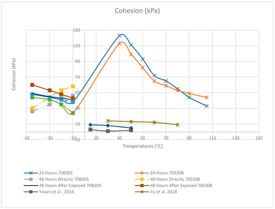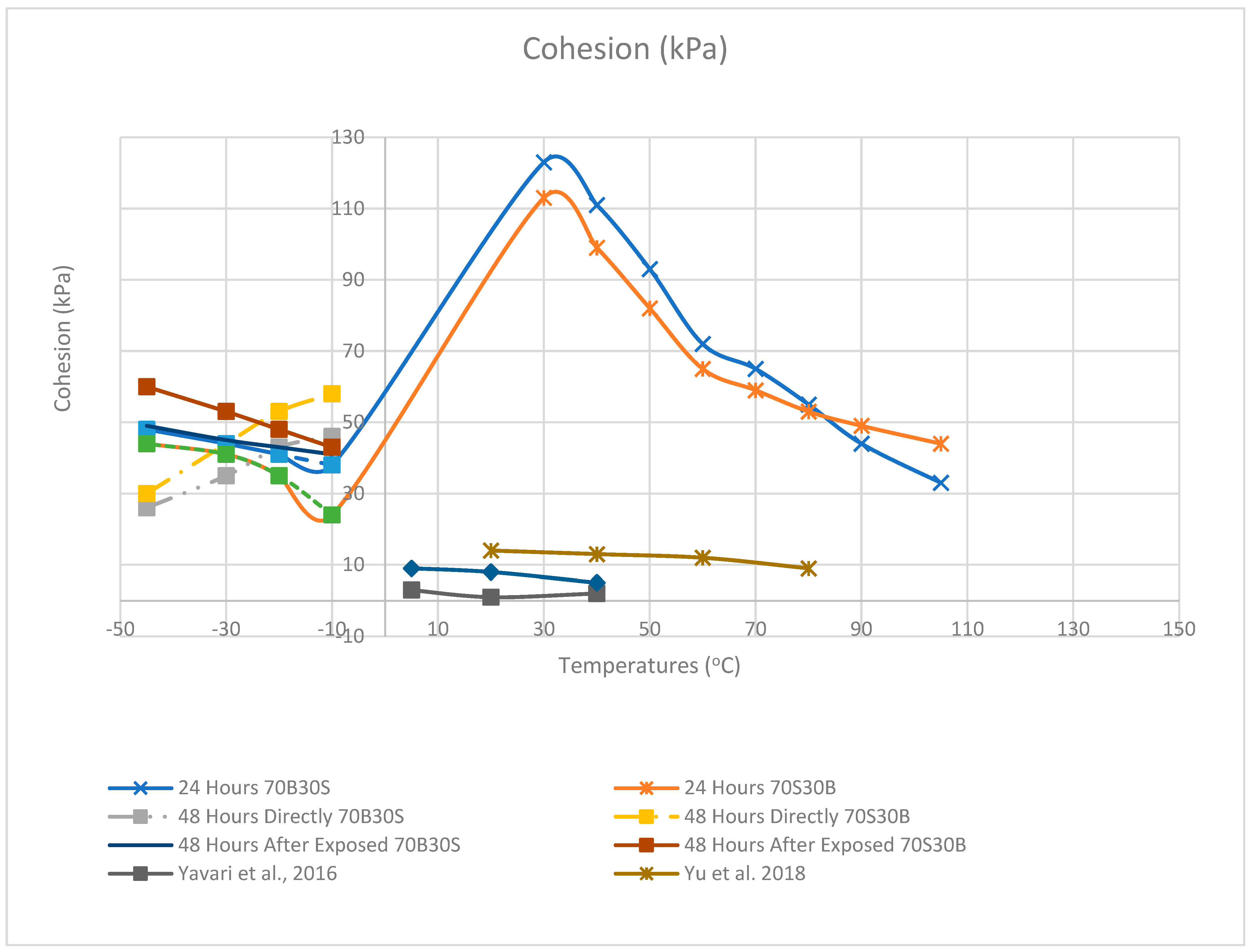 - After a 24 h exposure to freezing conditions, the c values and shear strength increased with decreasing temperature, along with an increase in Φ values. After a 48 h exposure to freezing conditions, c values and shear strength still increased with lower temperatures, but Φ values decreased (Figure 7).