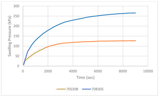 When soil is subjected to thermal loads and temperature changes, the safety of engineering structures located on these soils can be seriously affected. Therefore, a detailed understanding of the swelling properties of soils and the effect of temperature changes on these properties is of critical importance. In this study, the constant volume method was used to evaluate the effects of different temperature conditions on the swelling pressure of soils. Table 6 and Figure 9 present the results of the experimental studies conducted at laboratory temperature (20–24 °C) representing the standard air conditions of the geotechnical laboratory where the study was conducted for the mixtures 70B30S and 70S30B, without considering the effects of thermal changes. These results allow the comparison of the swelling behavior of different soil mixtures and provide a basis for better understanding the effect of thermal conditions.