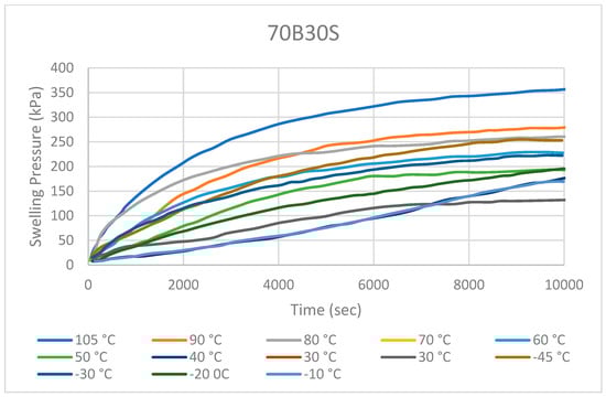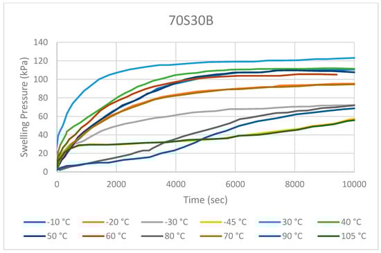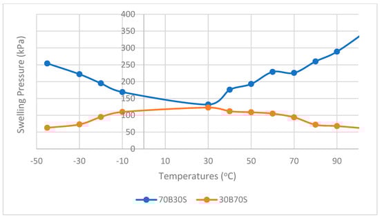 The results obtained from the swelling pressure tests show that there are significant changes in the swelling properties of bentonite–sand mixtures (BSMs) in the temperature range between 30 °C and 105 °C. These changes, which are visually expressed in Figure 10, Figure 11 and Figure 12, reveal the main differences in the mechanical responses of the two different mixtures against temperature. In particular, the bentonite-dominated 70B30S mixture exhibited a significant increase in the swelling pressure values as the temperature increased and this increase was measured to be approximately ±168%. This can be explained by the high water retention capacity of bentonite and the fact that heat causes the water in the intermolecular spaces to expand. On the other hand, the swelling values decreased by approximately ±51% with increasing temperature in the sand-dominated 70S30B mixture. This decrease in sand-dominated mixtures can be attributed to the low water-holding capacity of sand and less thermal sensitivity. Similarly, the experiments conducted in the temperature range between −45 °C and −10 °C revealed a reverse trend in the swelling values of these mixtures. Under cold temperature conditions, the swelling values of the 70B30S mixture increased by about 56% as the temperature decreased. This increase can be attributed to the crystallization of water between the clay particles at low temperatures and the widening of the distance between the particles. On the other hand, the swelling values of the 70S30B mixture decreased by about 46% in the same temperature range and this was explained by the low plasticity properties of the sand.