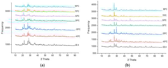 In this study, the effect of temperature change on the mechanical and physical properties of soils was investigated. The temperature-induced change in the microstructure of clay minerals has an irreversible effect on the cation exchange capacity and permeability of the clay microstructure (Ouhadi et al., 2010 [78]). The soils exposed to different temperature conditions were subjected to an XRD analysis to elucidate the underlying causes and effects (see Figure 13a,b). However, in this study, this effect was not clearly observed in the microstructure; this may be due to the low temperature difference applied during the experiment. In order to detect more significant changes, it may be necessary to extend the investigated temperature ranges. In addition, clay minerals usually require extreme thermal changes to show significant structural changes since their layered crystal structures are relatively stable under moderate heating. Studies have shown that temperatures exceeding 150 °C are usually required to cause significant changes in the basal range or interlayer water of clay minerals; the limiting data in the study are sufficient to explain the limited microstructural changes to be observed.