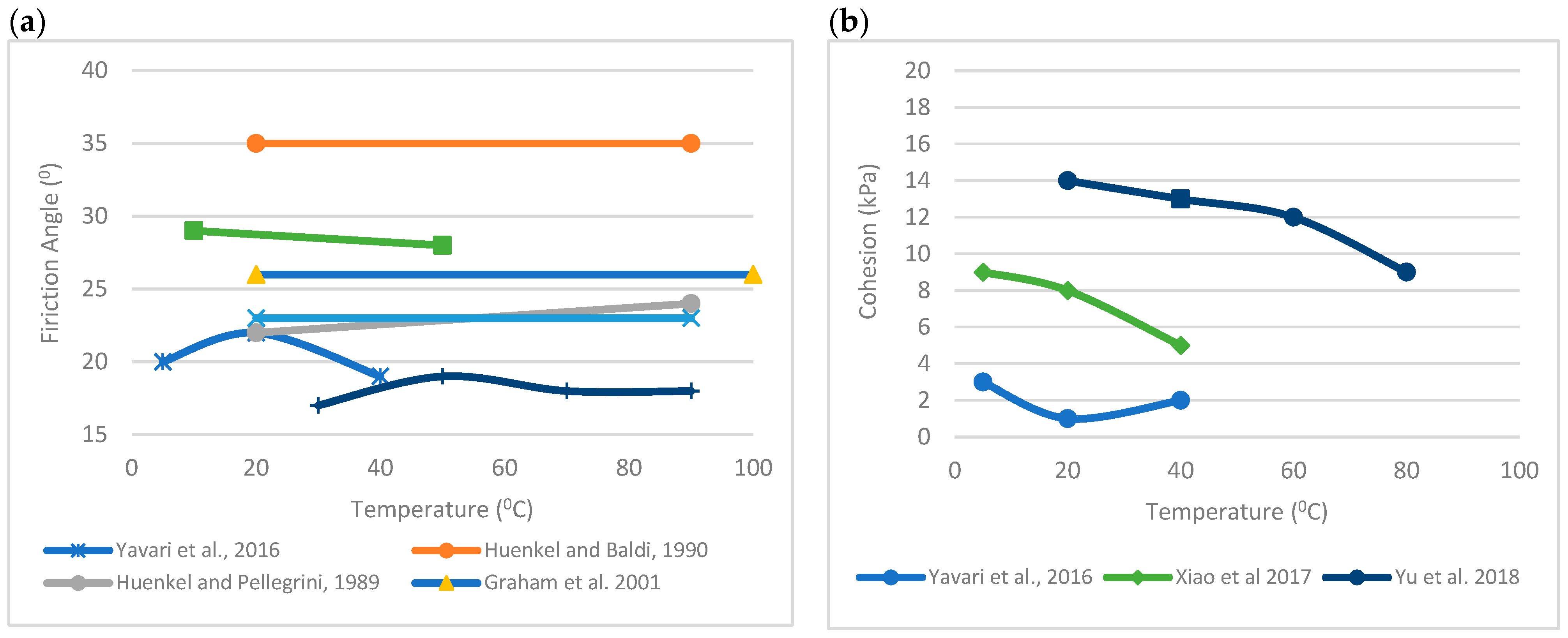 - Hoseinimighani, H.; Szendefy, J. A Review on Effect of Temperature Change on Mechanical Parameters of Fine Soils. Period. Polytech. Civ. Eng. 2021, 65, 825–839. [Google Scholar] [CrossRef]
