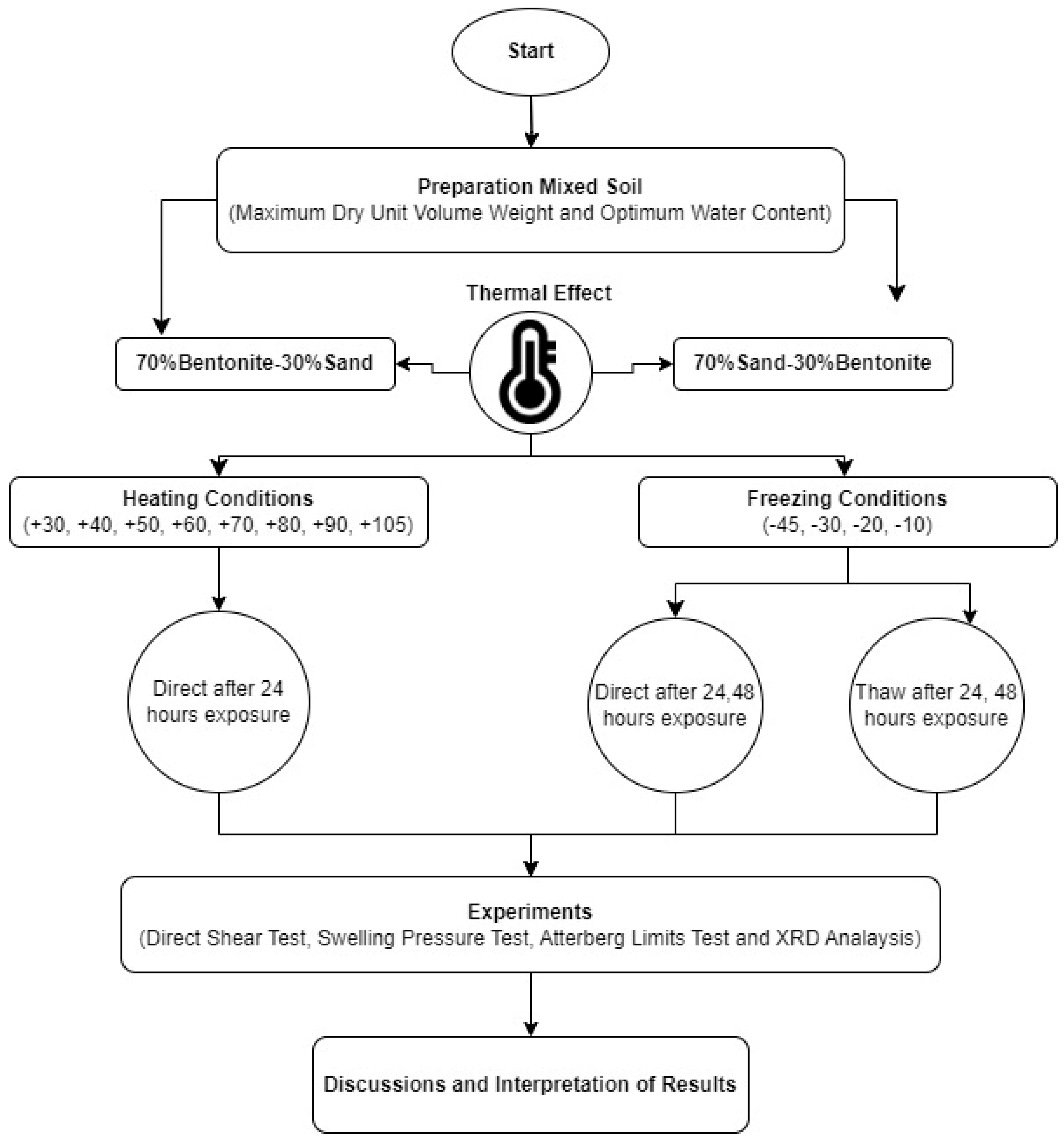 - Heating Conditions: The soil samples were carefully wrapped and placed within a laboratory oven chamber for a duration of 24 and 48 h, maintaining a constant temperature as specified by the test protocols provided in Figure 2. Subsequently, the soil samples underwent swelling pressure tests, box shear tests, and consistency limit tests.