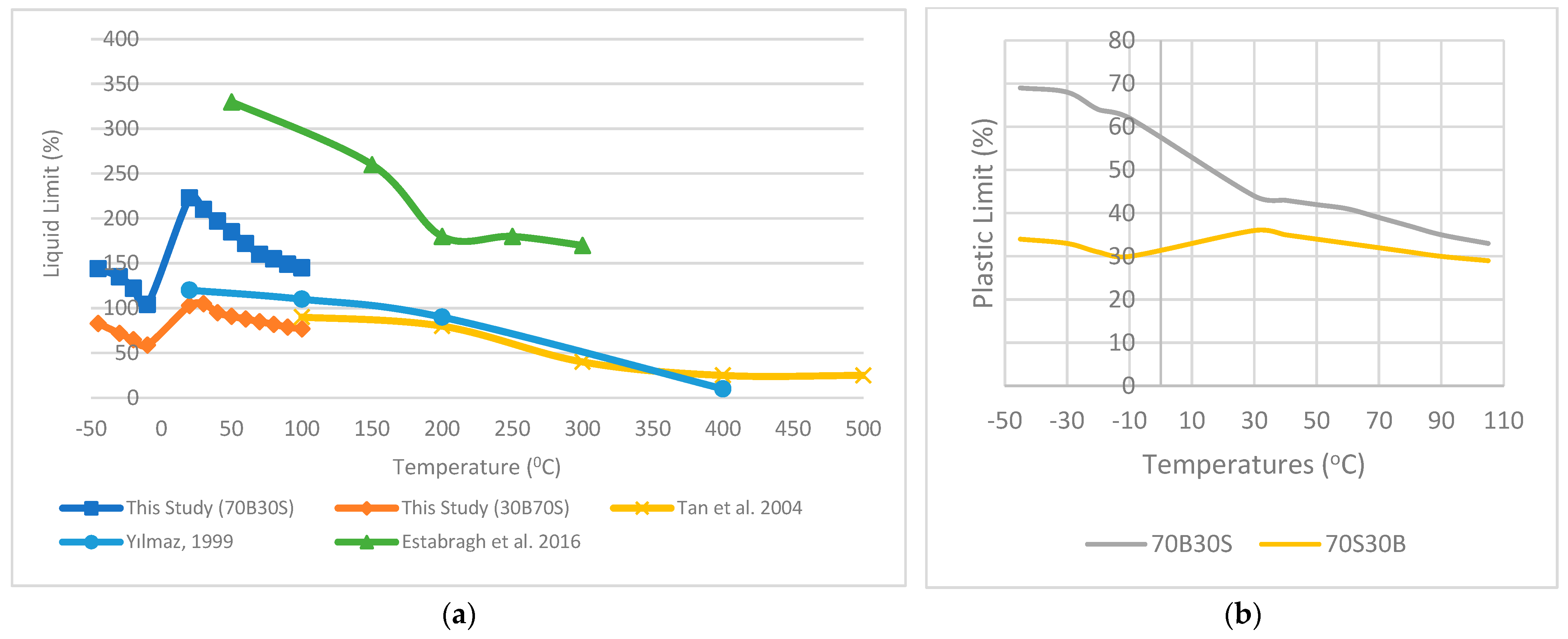 Temperature (°C) | Liquid Limit | Plastic Limit | Plasticity Index | |||