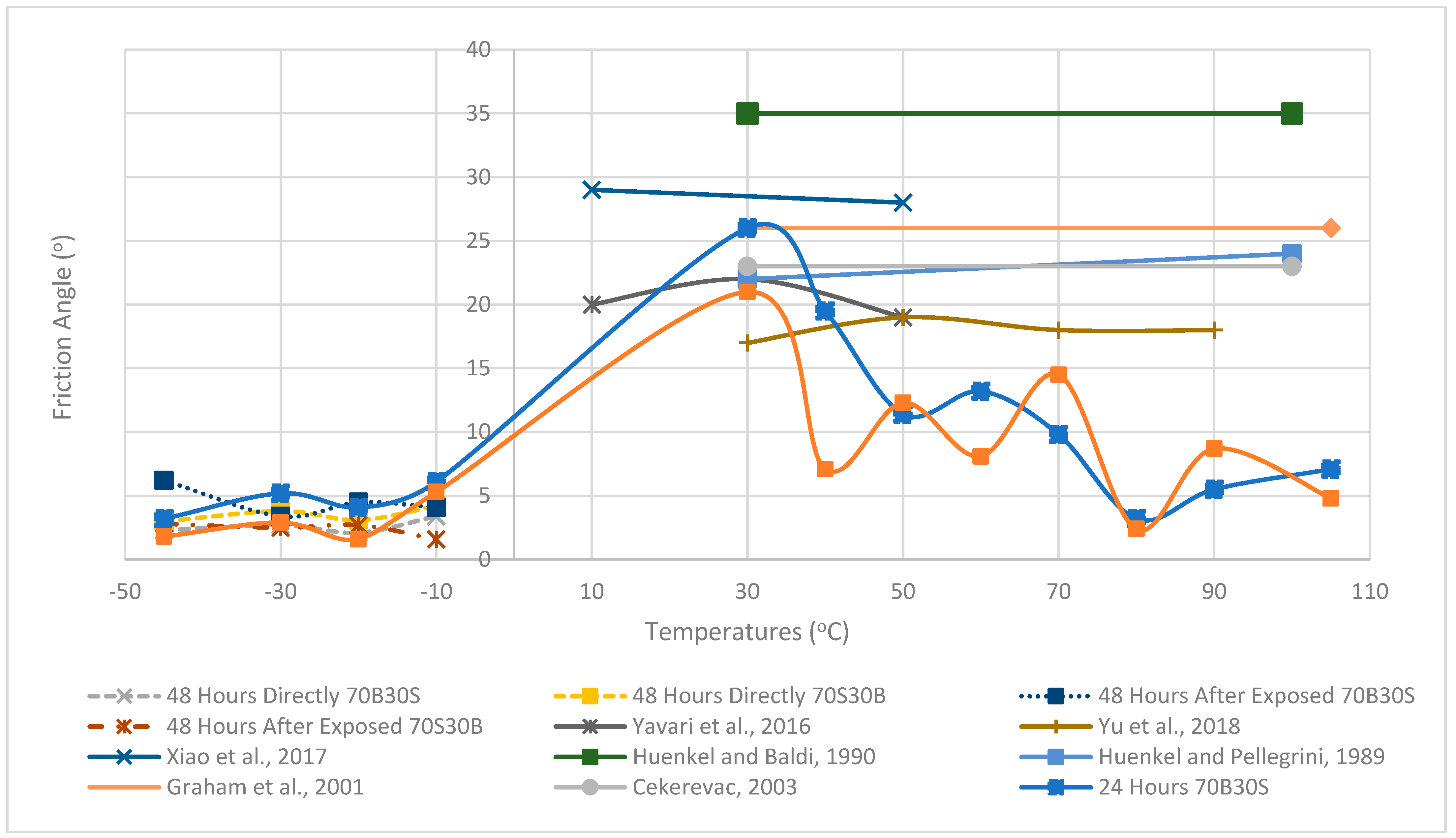 - Yavari, N.; Tang, A.M.; Pereira, J.-M.; Hassen, G. Effect of Temperature on the Shear Strength of Soils and the Soil–Structure Interface. Can. Geotech. J. 2016, 53, 1186–1194. [Google Scholar] [CrossRef]
