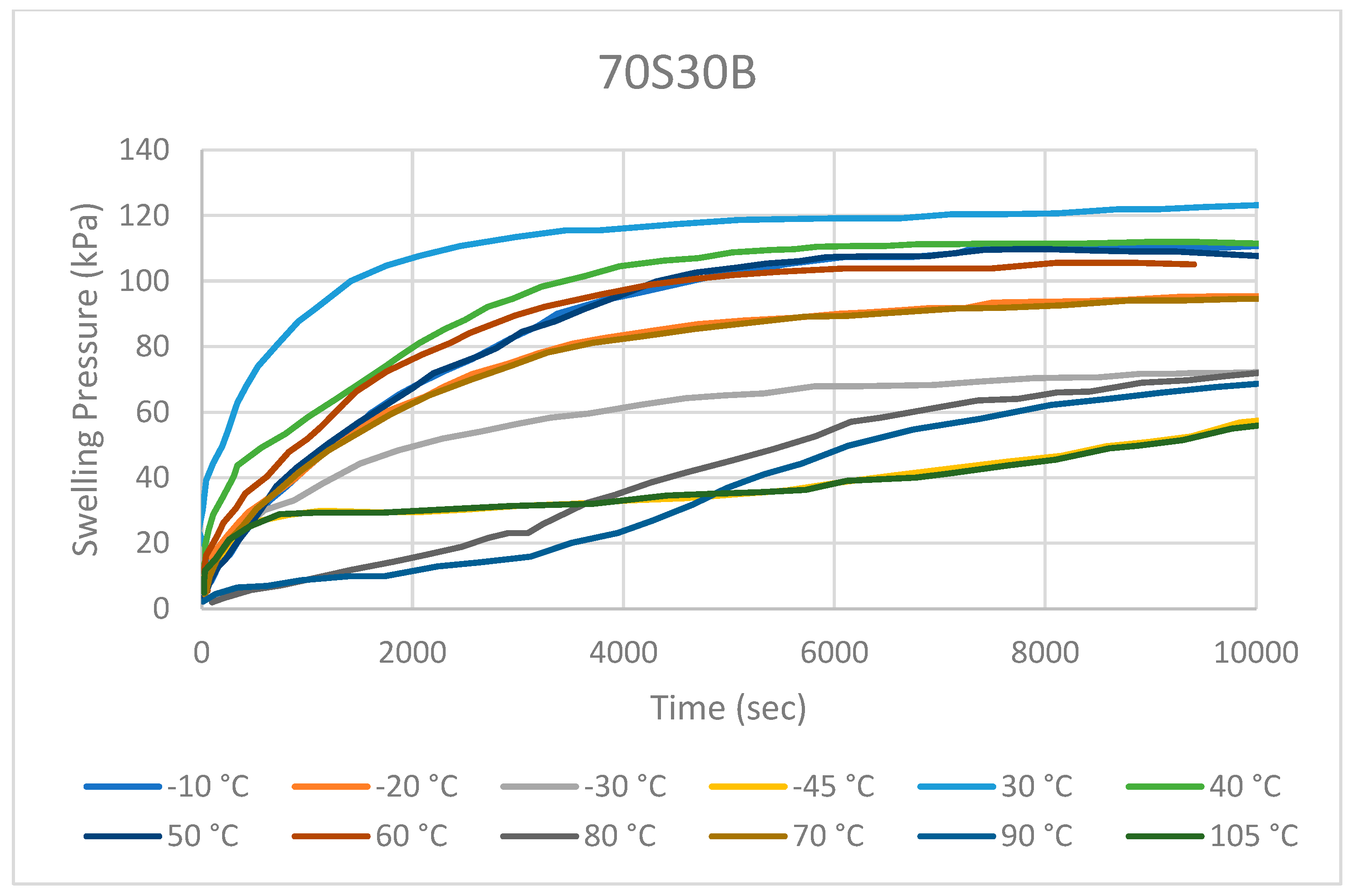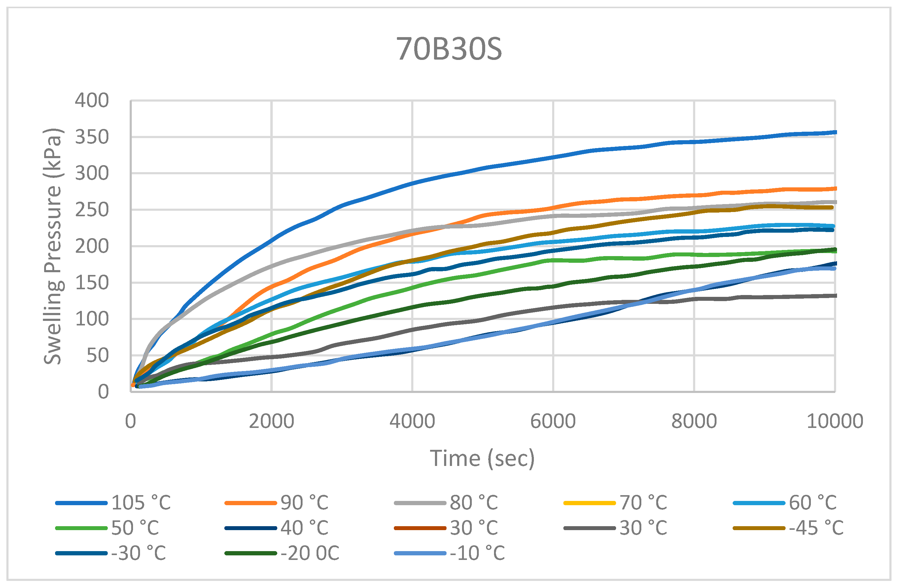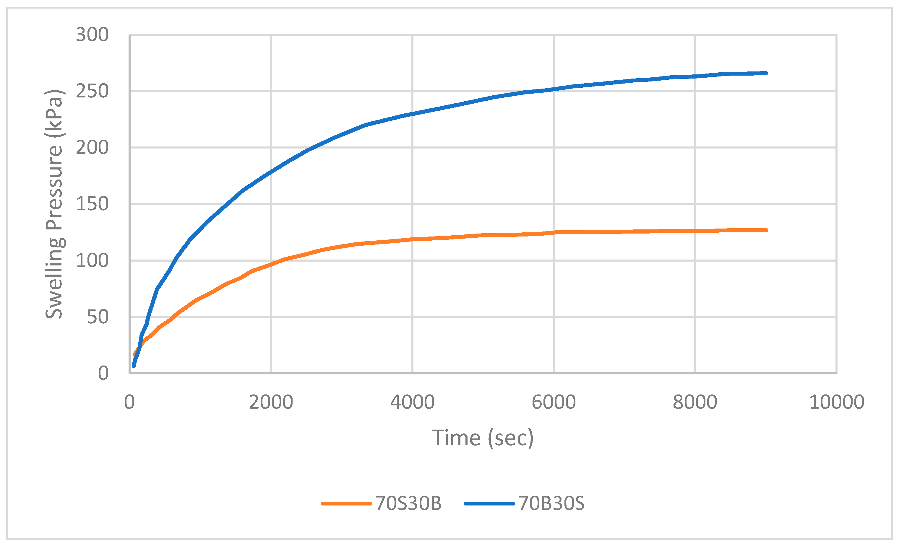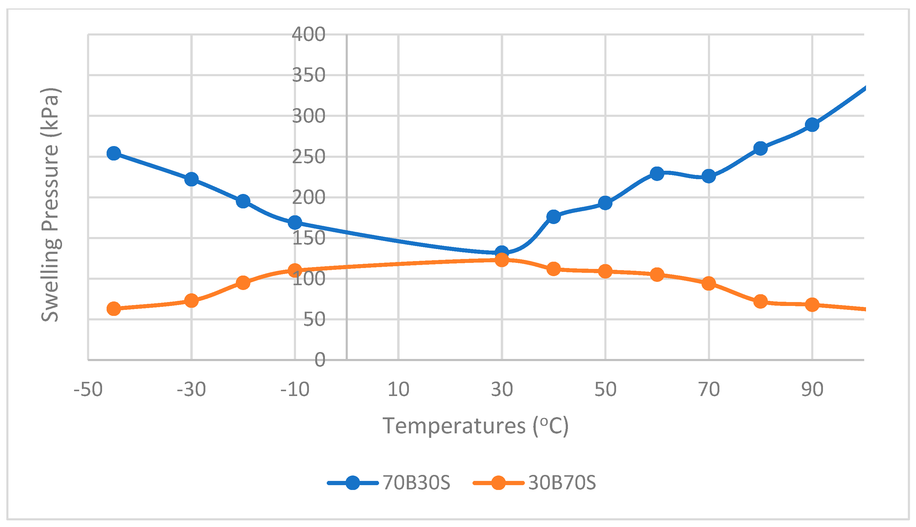 - Akinwunmi, B.; Sun, L.; Hirvi, J.T.; Kasa, S.; Pakkanen, T.A. Influence of Temperature on the Swelling Pressure of Bentonite Clay. Chem. Phys. 2019, 516, 177–181. [Google Scholar] [CrossRef]
