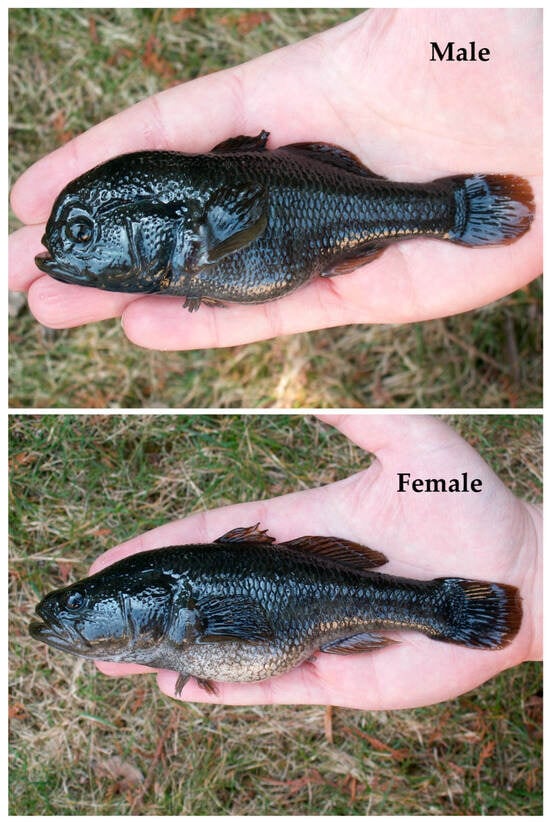 A total of 597 Chinese sleeper specimens were collected (Figure 2) and, after transport to the laboratory, measured (total length—TL, mm and standard length—SL, mm) using an electronic calliper with an accuracy of 0.1 mm (115/B, Toolpack, Poland) and weighed with an accuracy of 0.1 g, using a digital balance (WLY 1/D, Radwag, Poland). Sex was determined by histological examination of the gonads [31]. Fulton’s coefficient was calculated using the formula [32]: