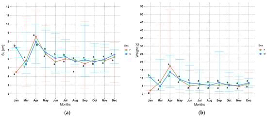 However, as expected, these differences in standard length (SL) and body weight (W) were recorded by month of the year (Figure 3).