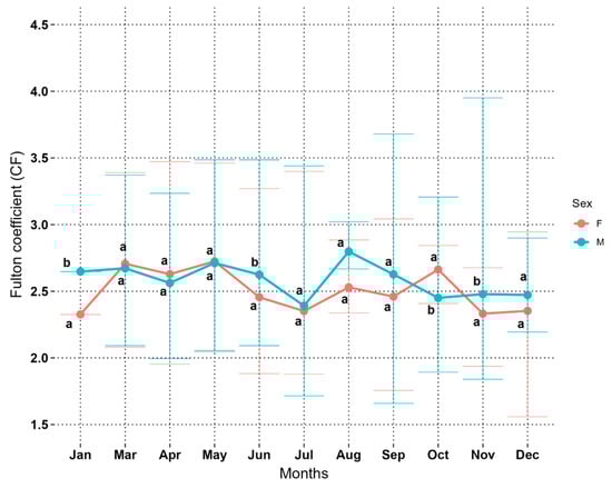 Monthly fluctuations in the condition factor (CF) values for female (F) and male (M) of Chinese sleeper from the Wilanówka River. Values marked with different letters (a, b) indicate statistically significant differences in CF between females and males in each month (Mann–Whitney Wilcoxon test, p < 0.05); mean ± SD.