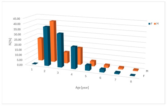 In many populations of Chinese sleeper, the maximum recorded age of individuals is 4+ [35]; however, some populations include individuals aged up to 7+ [16,52]. In the population we studied, the maximum observed age was 8+, although fish aged 7+ and 8+ were recorded only sporadically, mainly during the fishing season in April, May, and September, collectively representing approximately 1.75% of the total population. These older and larger individuals likely enter this watercourse primarily for reproductive purposes and subsequently migrate back to the Vistula River after spawning (unpublished information from anglers). In contrast, the population dominated by younger age groups of 1+ to 3+, which together accounted for 72.18% of the population. This age distribution aligns with findings from other European populations of this species [52,53].