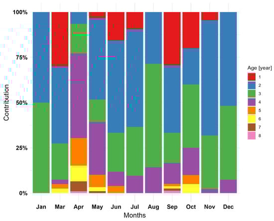 Eight age groups were recorded in the population structure of both males and females, among which males were dominated by fish aged 1+ and 2+, accounting for 63.28%, while females were dominated by fish aged 2+, 3+ and 4+, accounting for 87.98%. At the same time, when analysing the age structure of fish over the annual cycle (Figure 5), fish aged 2+ and 3+ were recorded in all months of the year, while fish aged 1+ and 4+ were recorded in seven and ten months of the year, respectively. The presence of older fish was inconsistent, suggesting that they may have periodically entered the study section of the river from the estuarine area (Figure 6).