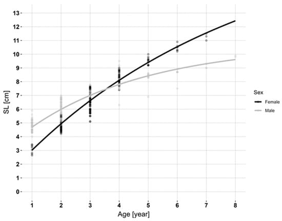 The growth curves of the von Bertalanffy model were fitted to the SL data in each year of the fish’s life. The estimated parameters of the von Bertalanffy equations for the whole population were as follows: L∞ = 175.37 mm (±24.38 mm), k = 0.104 (±0.024), t0 = −1.711 (±0.242), with a growth performance φ′ of 1.505. Differences in individual growth parameters were recorded between females and males (Table 6), indicating differences in the growth of these groups of fish (Figure 7).