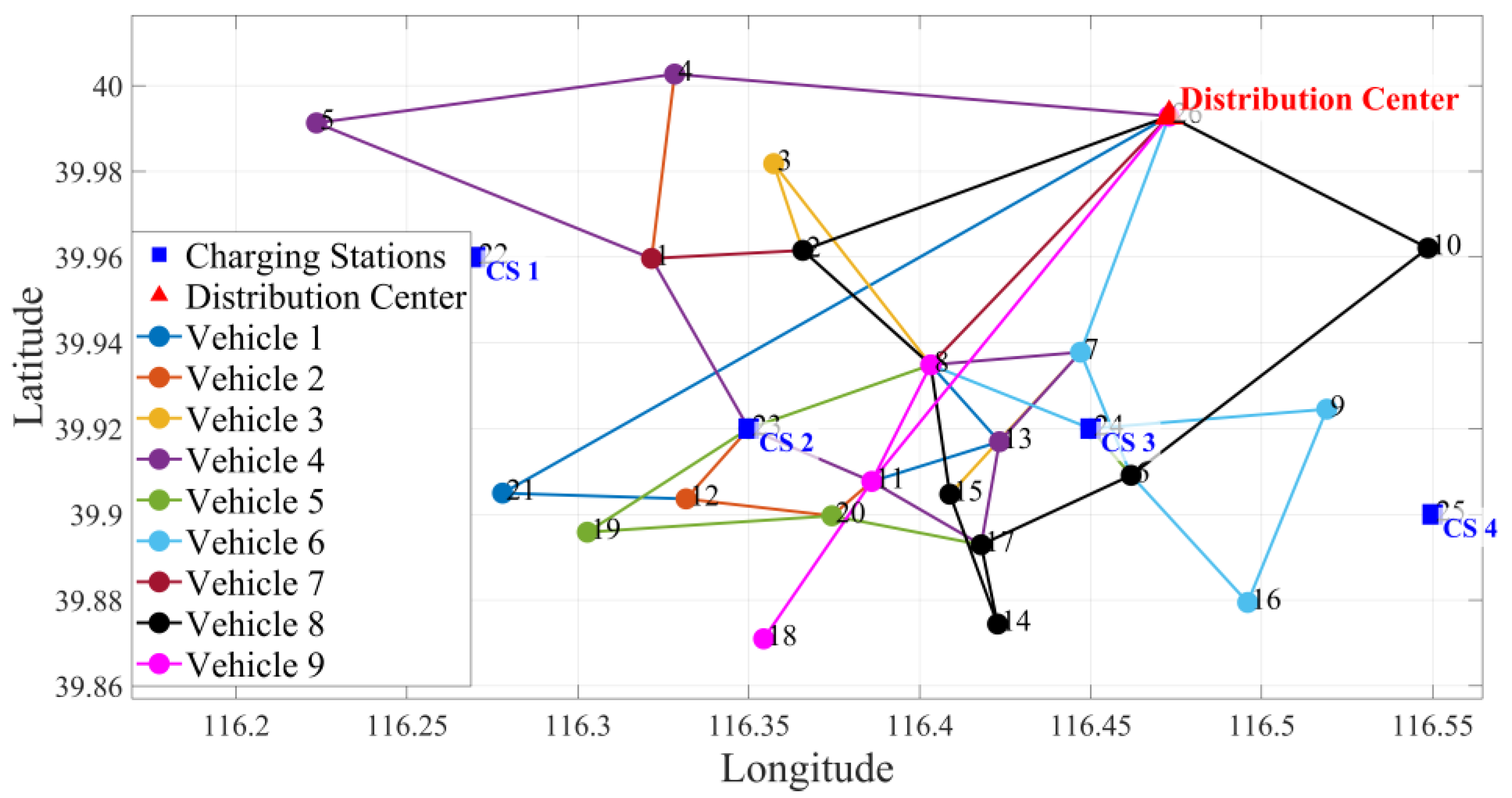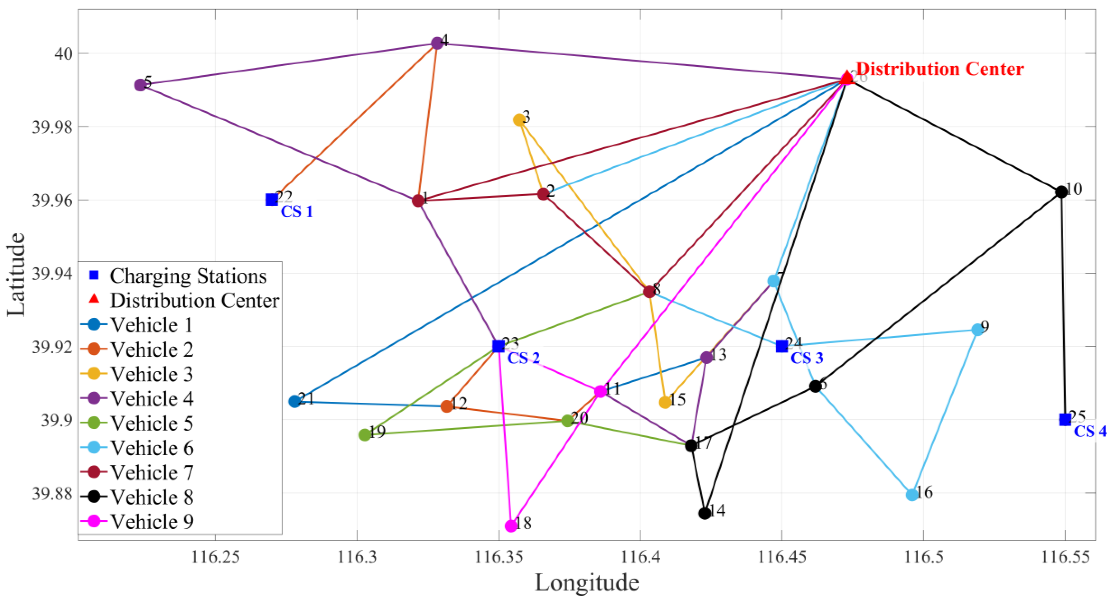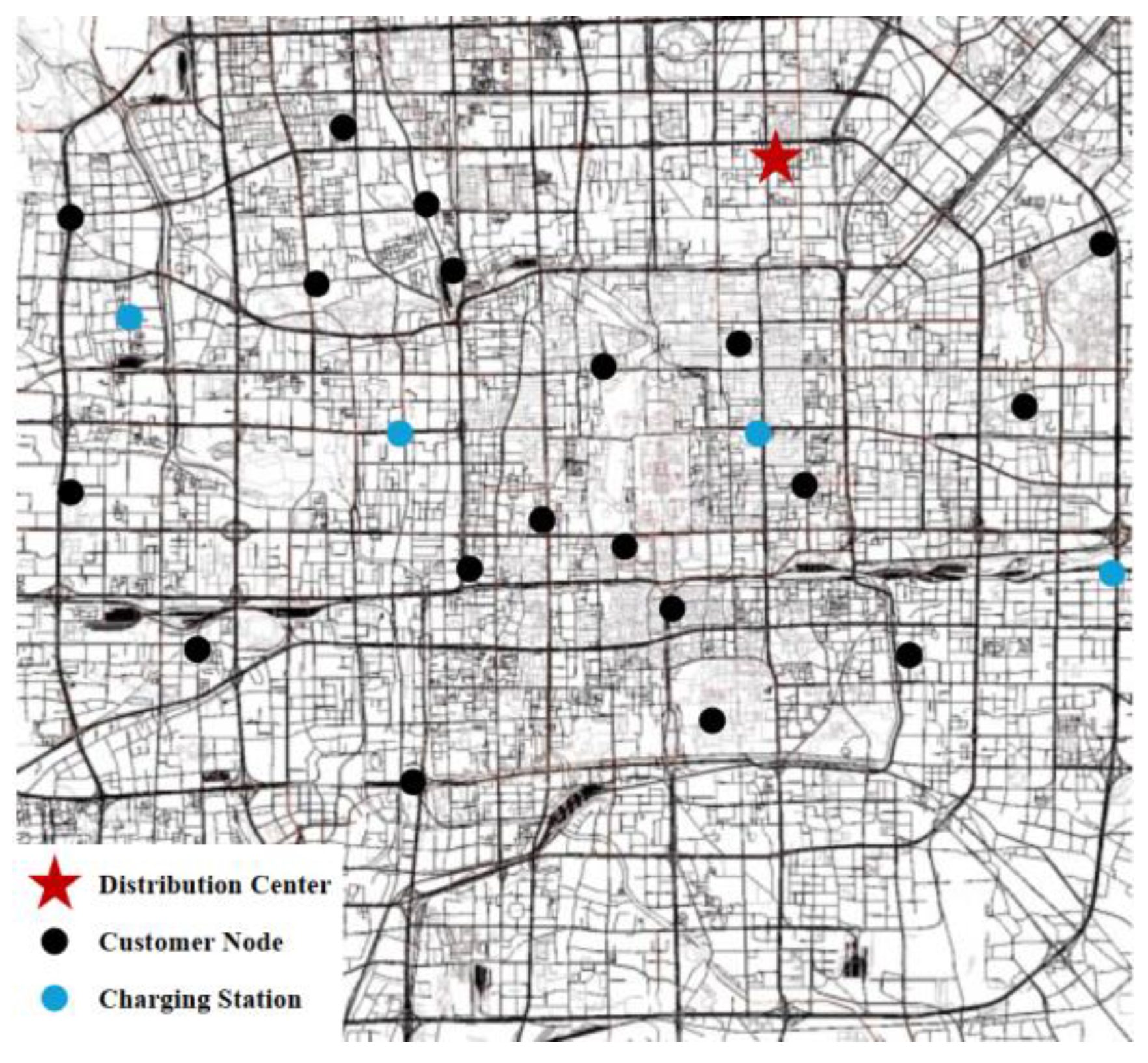 Ct | The cost of time (¥) incurred by all vehicles to drive, recharge, and perform delivery tasks. | Vmax | Maximum speed of electric vans (km/h) |