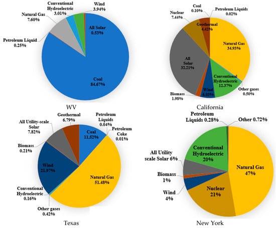 WV’s electrical generation has long been dominated by coal; this share is expected to decline as more coal-fired power plants are being retired. Before 2013, natural gas was rarely used for power generation; however, as local reserves were tapped and distribution infrastructure was brought online across sections of the state, its portion of the state energy portfolio has slowly expanded. The 2023–2027 WV economic outlook forecasts that upward price pressures stemming from the 2022 invasion of Ukraine and incentives from H.R.5376, commonly known as the Inflation Reduction Act, will prompt an expansion of natural gas production in the state by 5% per year, on average [4]. As shown in Figure 1, it is evident that WV remains highly dependent on locally produced coal for power generation (85%) in 2024, with negligible dependency on solar and other renewable energy resources. In contrast, states, such as California and Texas, are transitioning away from traditional sources, with renewable sources, like solar, accounting for 32.21% and 7.82% of their respective power generation capacities.