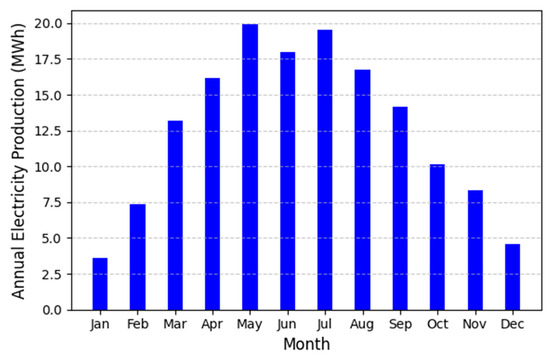 Equation (3) was used to calculate the maximum corrected daily electricity production for each month; Figure 12 illustrates the monthly values for the year 2023. Solar electricity generation was suspended from early May to mid-September 2024 due to roof reinstallation. Therefore, Figure 13 presents data from 2023, the most recent uninterrupted year.