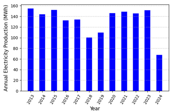 Figure 4 shows the annual electricity output from 2013 to 2024, assessed from January to December. The solar power plant, installed in June 2012, generated 69.93 MWh in 2012 (not included in the figure). Between 2013 and 2024, the array produced a total of 1587.66 MWh of electricity. The highest annual generation, 154.54 MWh, was recorded in 2013, while the lowest output, 67.83 MWh, occurred in 2024. Figure 4 highlights that power production in 2018 and 2019 was significantly lower compared to other years. This discrepancy is attributed to missing electricity production data during several weeks in these two years. In 2018, data were unavailable for 5 days in January, 12 days in May, and consecutively from 16 July to 9 September, including the entire month of August. Similarly, in 2019, data were missing for 21 days in May and continuously from 1 July to 16 August, including the entire month of July. For 2018 and 2019, most of the missing data were from the summer months, which significantly contributes to the lower power production observed during these years compared to others. The likely causes for this data unavailability include scheduled maintenance, roof reconstruction, and repair to the failed inverter during these periods.
