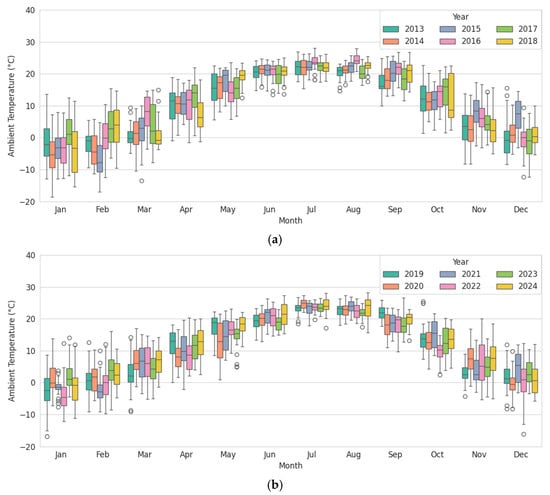 Solar irradiance data at this location for 2013–2024 were not measured. In this research, the global tilted irradiance (GTI) for this solar plant was calculated from the NASA POWER website [26]. The NASA POWER tool uses satellite data to deliver long-term insights into solar irradiance, temperature, wind, and humidity, which can be downloaded for analysis. It supports research, planning, and energy project development, as well as assessing renewable energy potential. These satellite and model-based data provide reliable meteorological resources, particularly in areas lacking real-time ground measurements [27,28]. Due to the extensive dataset representing 12 years (2013–2024) of ambient temperature for the plant location, the statistical interquartile range method was applied to analyze and compare the monthly average ambient temperatures. For a more effective analysis of variations in monthly ambient temperature, the dataset was divided into two periods: Figure 5a represents data from 2013 to 2018, while Figure 5b covers 2019 to 2024. The analysis reveals that the ambient temperature exhibits greater variation during the winter months compared to the summer months. The highest ambient temperatures, ranging from 25 to 30 °C, are observed in the summer months of July and August. Conversely, the lowest temperatures, between −10 and −20 °C, occur during the winter months of December to February.