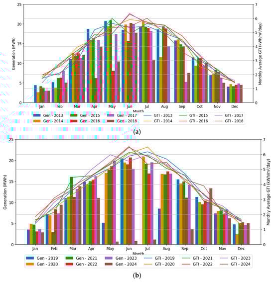 Variation in monthly electricity generation (MWh) and GTI (kWh/m2 /day) of 140 kW solar PV plant at climatic conditions: (a) year 2013 to 2018; and (b) year 2019 to 2024.