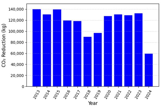 Figure 9 illustrates the CO2 emissions mitigated by the PV solar panel system for electricity generation between 2013 and 2024. Different year-specific emission factors were applied to calculate the CO2 mitigation for the period 2013–2024. The highest CO2 reduction occurred in 2013, with 140,009 kg mitigated, while the lowest reduction was recorded in 2024, with 59,216 kg. Over the entire period from 2013 to 2024, the total CO2 emissions reduced amounted to 1,413,497 kg. The unavailability of electricity generation data for certain days in 2018, 2019 and 2024 explains the lower CO2 emissions recorded in these years compared to other years.