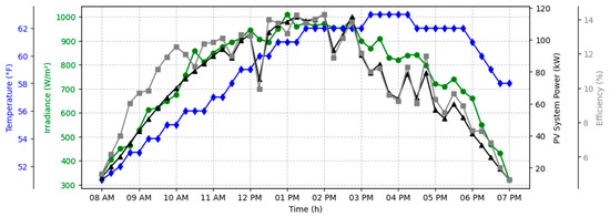 As illustrated in Figure 11, higher efficiency levels were recorded during the afternoon hours, particularly between 12:30 PM and 2:00 PM. The peak efficiency of 14.30% occurred at 2:00 PM, while the average efficiency for the entire measurement period (8:00 AM to 7:00 PM) was 10.70%. Lower efficiency values were observed in the morning and evening hours, as the solar panels received less irradiance during those times. Temperature readings were recorded using a temperature sensor, and ranged from 51 °F to 63 °F. Additionally, PV system power output (kW) data were collected every 15 min through the data logging system.