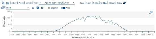 Figure 12 indicates the instantaneous power generation data for 15 min intervals obtained from the power monitoring software for 20 April 2024. At 2:00 PM, peak power was obtained at 115.94 kW. A brief drop in power production was observed from noon to 3 PM, which was likely due to clouds and curtailment.