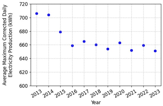 The average of the maximum corrected daily production for each month was 651 kWh in 2023, which was used to represent the performance of the panel in converting solar energy to electricity. Such a parameter largely eliminates the impact of weather on solar panel performance. Figure 14 illustrates the average of the maximum corrected daily production for each month between 2013 and 2023. In cases where data were missing, such as August 2018, the average production from other years was used to estimate the value for that month. The analysis revealed a sharp decline in solar panel performance from 2013 to 2016, as indicated by a drop in the average maximum corrected daily production from 706 kWh in 2013 to 659 kWh in 2016, reflecting an average annual degradation rate of 2.28%. However, from 2016 to 2023, the decline slowed significantly, with an annual degradation rate of just 0.17%. The average maximum corrected daily production between 2017 and 2023 was 658.8 kWh, closely aligning with the 659 kWh recorded in 2016 [30]. Since electricity production data for most days between May and September 2024 are unavailable, the performance degradation for 2024 could not be estimated.