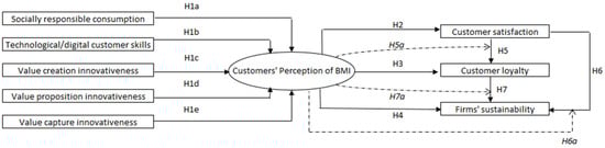 The individual hypotheses (H1a–H1e) illustrate how each specific dimension whether ethical, technological, or strategic independently contributes to customers’ perception of BMI. Each factor captures a distinct aspect of consumer value orientation or firm-level innovation capacity, influencing how customers evaluate the novelty, relevance, and strategic value of a firm’s business model. In practice, however, these factors rarely function in isolation. Customer perceptions of BMI are shaped by a multidimensional interplay of socially grounded values (e.g., SRC), digital competencies (e.g., TCS), and innovation strategies (e.g., VCrI, VPI, and VCI). This integrated view reflects the reality that consumers form holistic judgments of firms based on the simultaneous expression of ethical alignment, technological sophistication, and the perceived innovativeness of value delivery. Therefore, synthesizing the theoretical and empirical evidence from all BMI components, we propose the following comprehensive hypothesis: