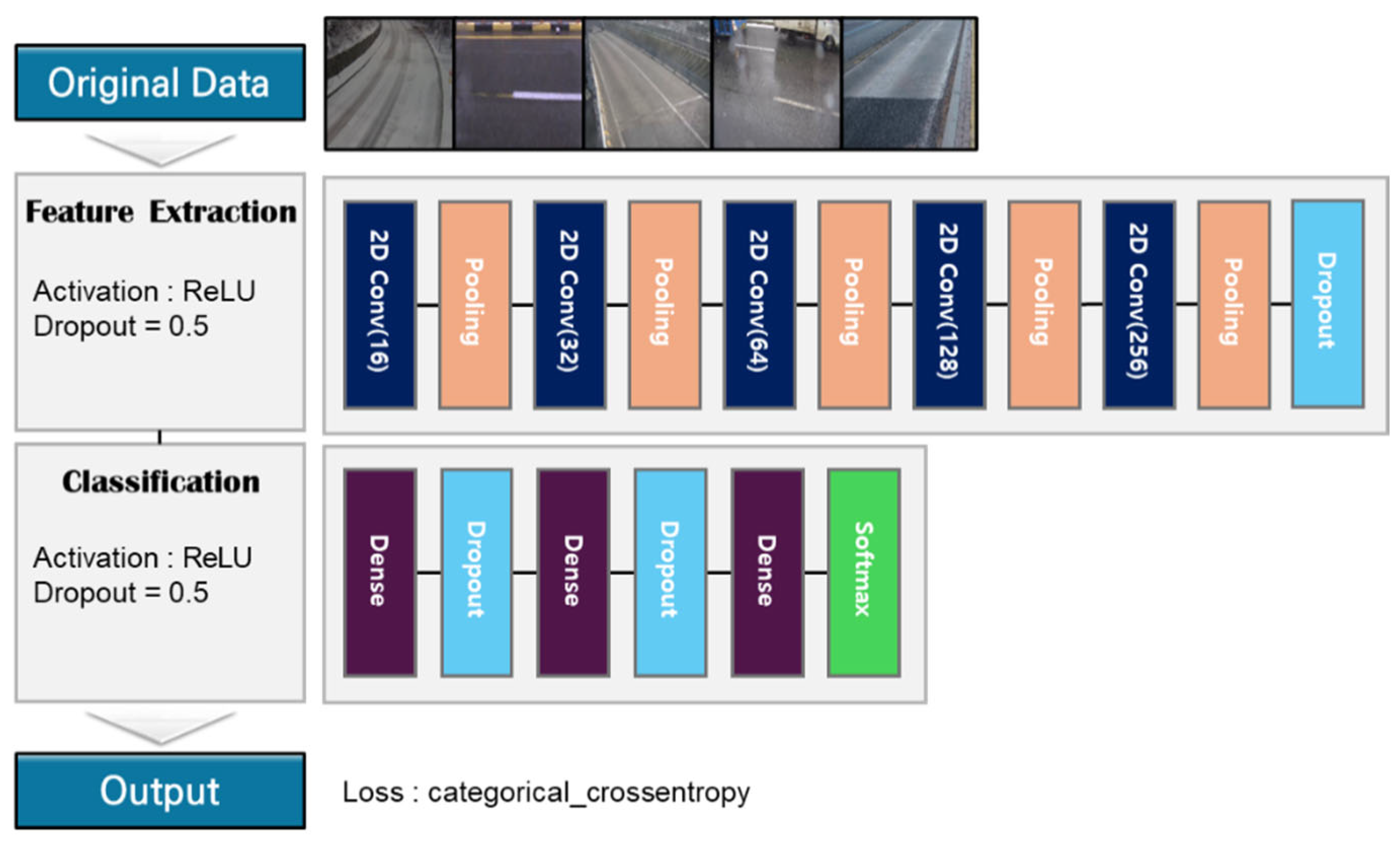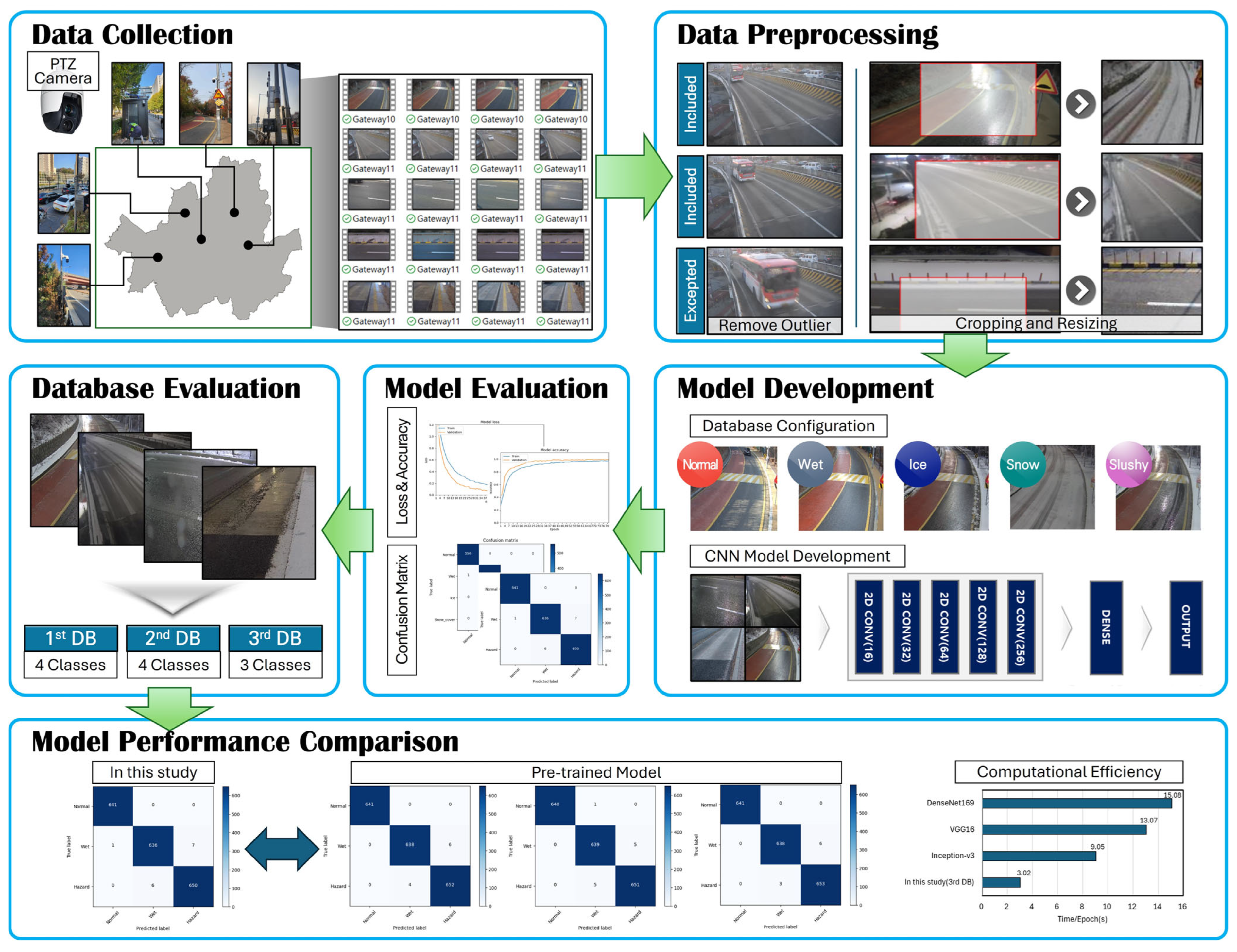 However, the primary objective of this study is to assist road managers in identifying hazardous road conditions, thereby enabling appropriate decision-making. Even if the ice class is misclassified as snow, road managers would still be expected to conduct snow removal operations and address the hazardous condition. Consequently, the likelihood of such misclassification leading to incorrect decision-making remains relatively low. In contrast, if an ice surface is misclassified as wet, there is a risk that no action will be taken despite the presence of a hazardous condition. Therefore, when developing a CNN model for predicting winter road surface conditions, it is more desirable from a safety perspective to classify slushy surfaces as either ice or snow, as in the second database. This approach is preferable to the method adopted in the first database.