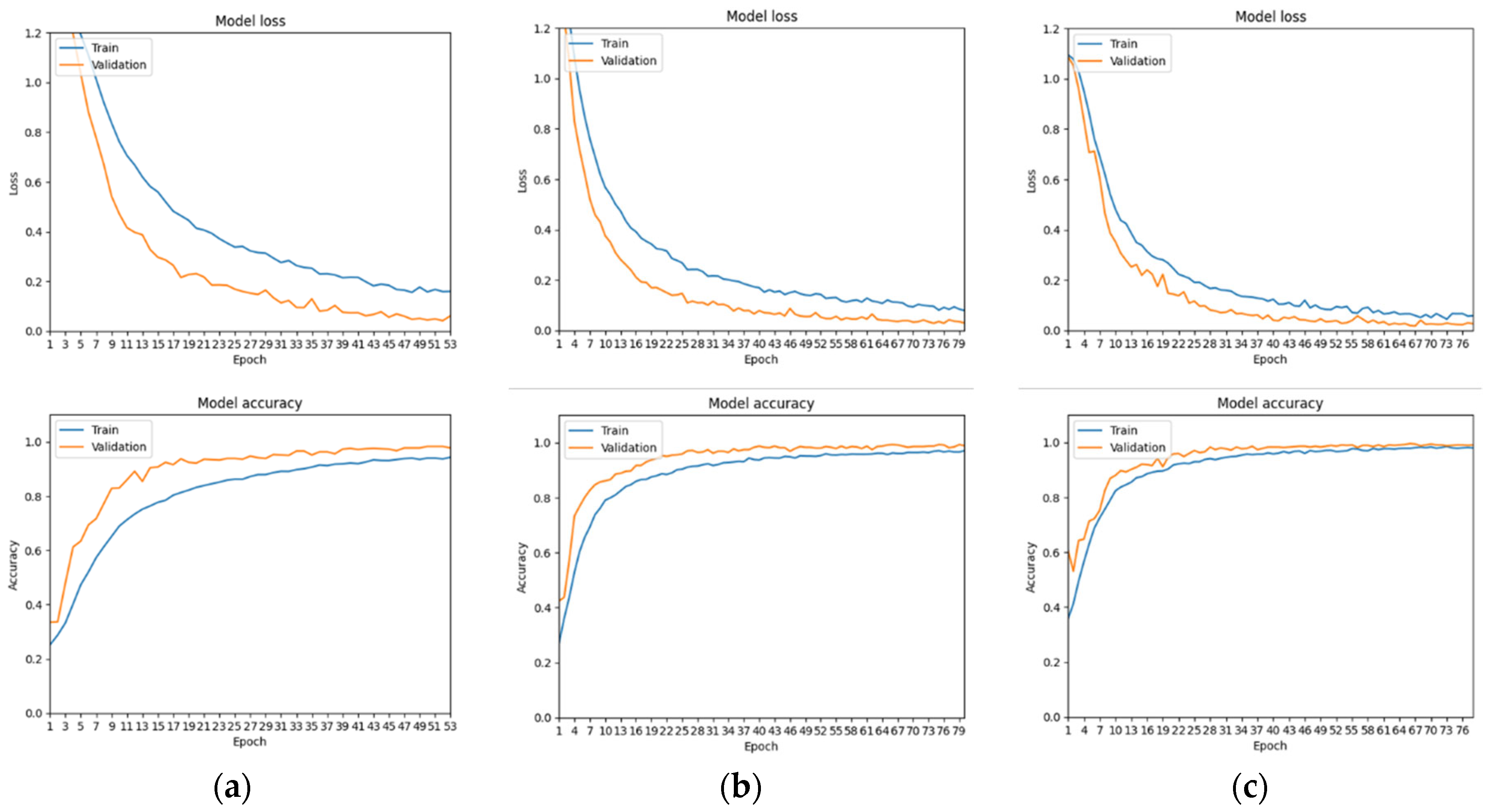 Figure 9, the vertical axis represents the actual data classes, while the horizontal axis shows the classes predicted by the model. In all cases, the model achieved consistently high accuracy in classifying the test data classes. In particular, predictions for the