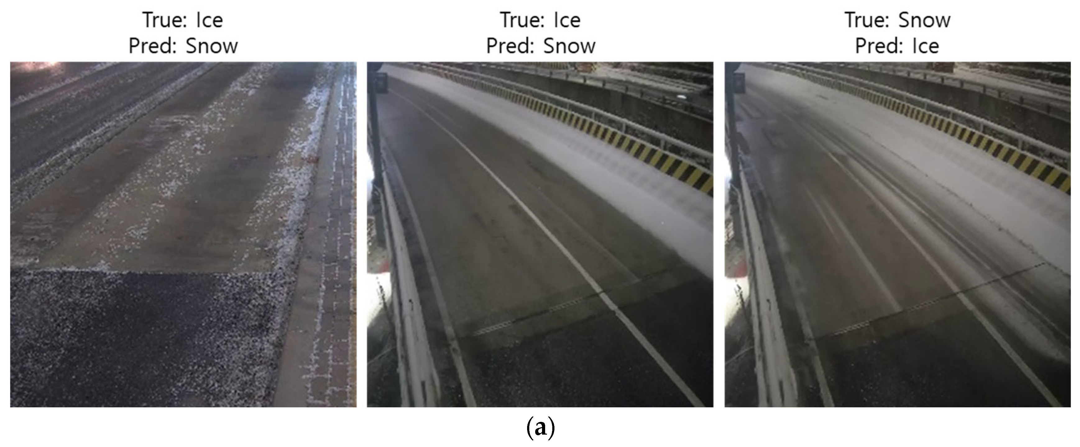 Figure 11b shows prediction errors for slushy road surfaces, where water, ice, and snow coexist, indicating that the model tended to classify them as either