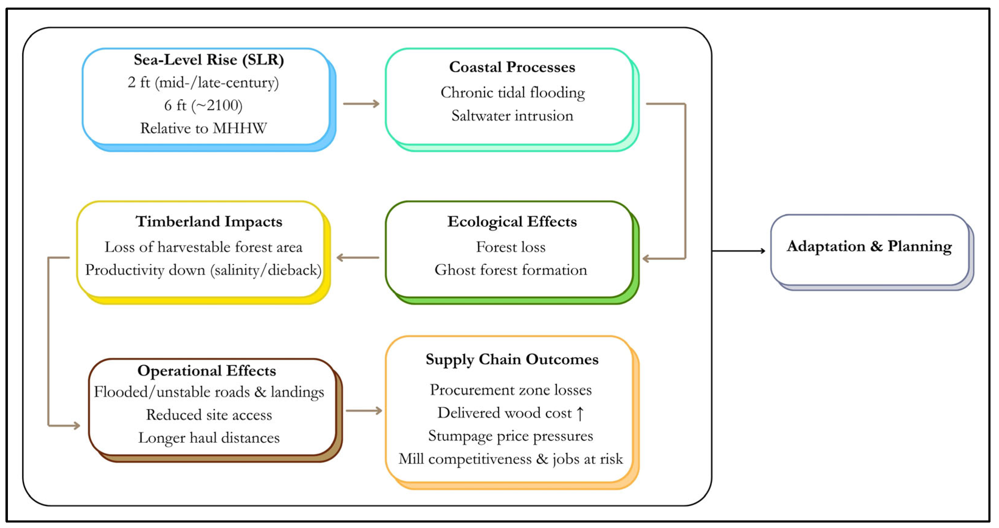 Figure 1 illustrates, these risks emerge through a sequence of processes: SLR introduces chronic tidal flooding and saltwater intrusion, which drive ecological changes, such as forest loss and ghost forest formation. These ecological impacts translate into timberland constraints, including reduced harvestable areas and declining productivity from salinity stress and dieback. Operational challenges follow, as flooded or unstable roads and landings restrict site access and force longer haul distances. Together, these dynamics culminate in supply chain outcomes: procurement zone losses, rising delivered wood costs, stumpage price pressures, and risks to mill competitiveness and local employment. Given the sector’s statewide economic contribution, even localized disruptions may carry broader market implications in Georgia [